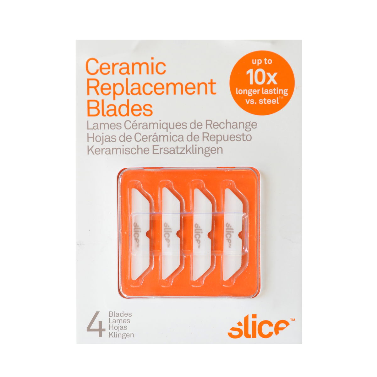 Slice Inc. provides precision ceramic cutting tools as a superior alternative to metal. Slice Ceramic Blades are more environmentally friendly and physically safe than metal blades. Made from pure Zirconium Oxide, these thicker, more durable blades, double-sided blades last longer; saving you money from the frequent metal blade replacements. The blades have rounded edges for safety, but still cut cleanly, and smoothly. One pack of four is equivalent to 80 high-end metal blades! Fits Slice Retractable Box Cutter, and Slice Retractable Pen Style Cutter