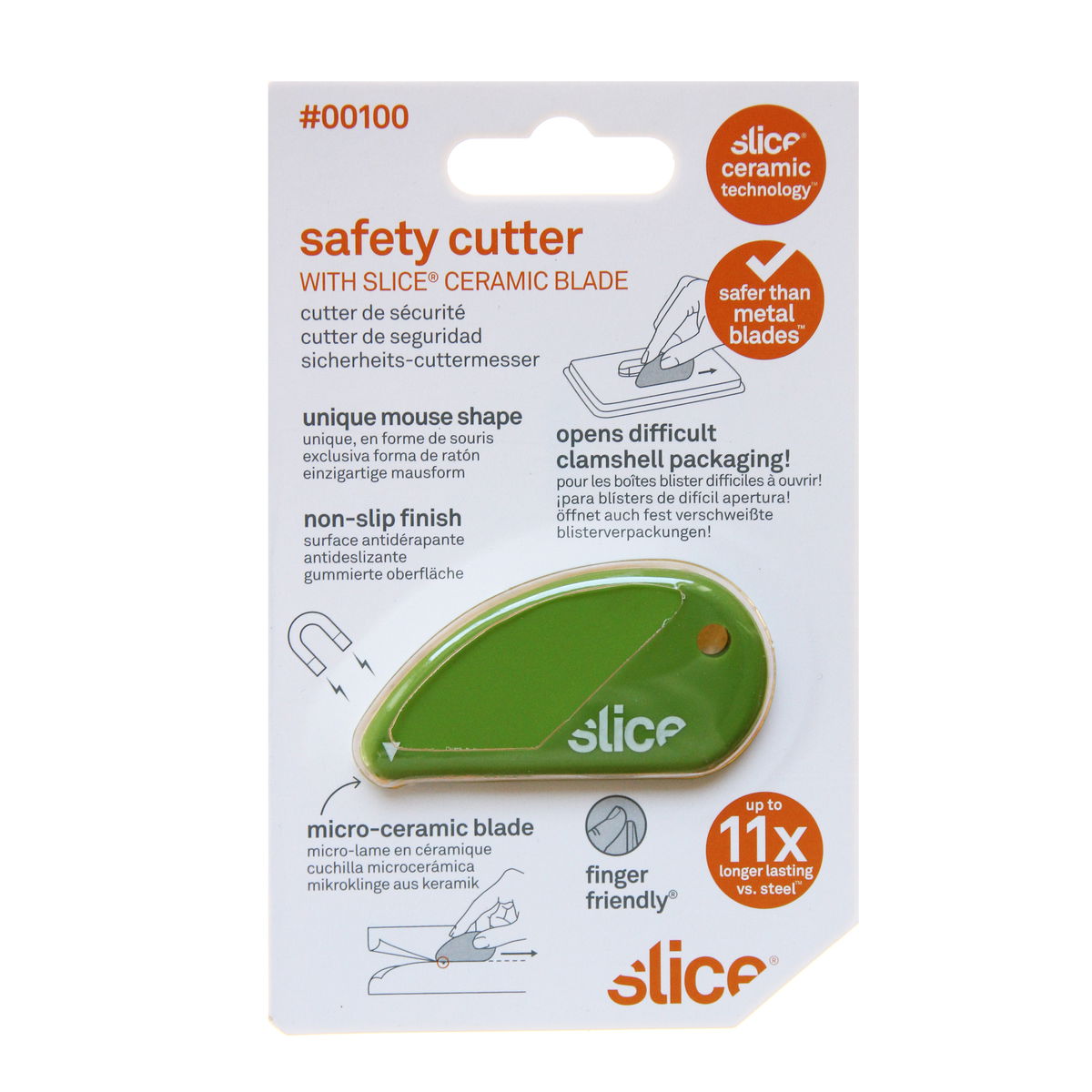 The Slice Safety Cutter is an award-winning innovative tool that s safe, convenient, and versatile. Its unique ergonomic mouse shape and rubberized non-slip material allow you to open, trim and cut with ease and comfort. This powerful little cutter has a minimally exposed micro-blade that is also finger friendly , keeping you safe while cutting a wide variety of materials. It s incredibly portable and convenient with an in-built magnet and key ring hole for easy access and storage, plus it s suitable for left- and right-handed users. Slice remains the first choice for safety and effectiveness in industrial settings and is now recognized as the leading safety cutter in homes. From its daily use on production floors to opening everyday items at home, the Safety Cutter makes people and places safer. Finger-friendly micro-blade with minimum exposure to maximize safety Ergonomic design and rubberized non-slip material for comfort and ease of use/li> Compact and lightweight, so it s highly portable Built-in magnet and keyring hole for additional convenience Suitable for left- and right-handed users Slice blades last 11.2x longer than traditional blades Great for: Slicing food packaging Opening boxes, packages and envelopes Opening difficult clamshell and blister packaging Cutting shrink wrap, bags, labels and tape People with arthritis