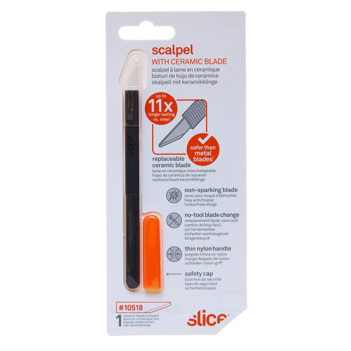 The Slice Scalpel gives you precision and versatility, keeps your workforce safe, and is ideal for working in tight spaces. The scalpel s finger-friendly blades are the safest you ll find in the workplace because they are safe to the touch, so cause fewer and less severe injuries than traditional blades. Plus, a safety cap additionally protects your workforce. This tool is compatible with craft, seam ripper, and chisel blades, making it highly versatile as it covers many applications, including scraping. The handle is lightly weighted for balance and stability, has a textured, anti-slip grip for added control, and the slim profile allows users to work in tight spaces. Furthermore, it s made from durable reinforced nylon, making it an ideal tool for industrial use. The scalpel is suitable for left- and right-handed workers, and the no-tool blade change mechanism saves time and further reduces injury risk. Finger-friendly blade is the only safety blade on the market Attachable safety cap for additional protection Compatible with multiple blade options for versatility Slim profile for working in tight spaces Textured anti-slip control grip Durable reinforced nylon handle built for industrial use Great for: Manipulating laboratory samples Precise electronics activity Scraping with chisel blade Suitable for left- and right-handed workers Simple and quick no-tool blade change Non-conductive blade for added safety Chemically inert blade that never rusts Slice blades last 11.2x longer than traditional blades