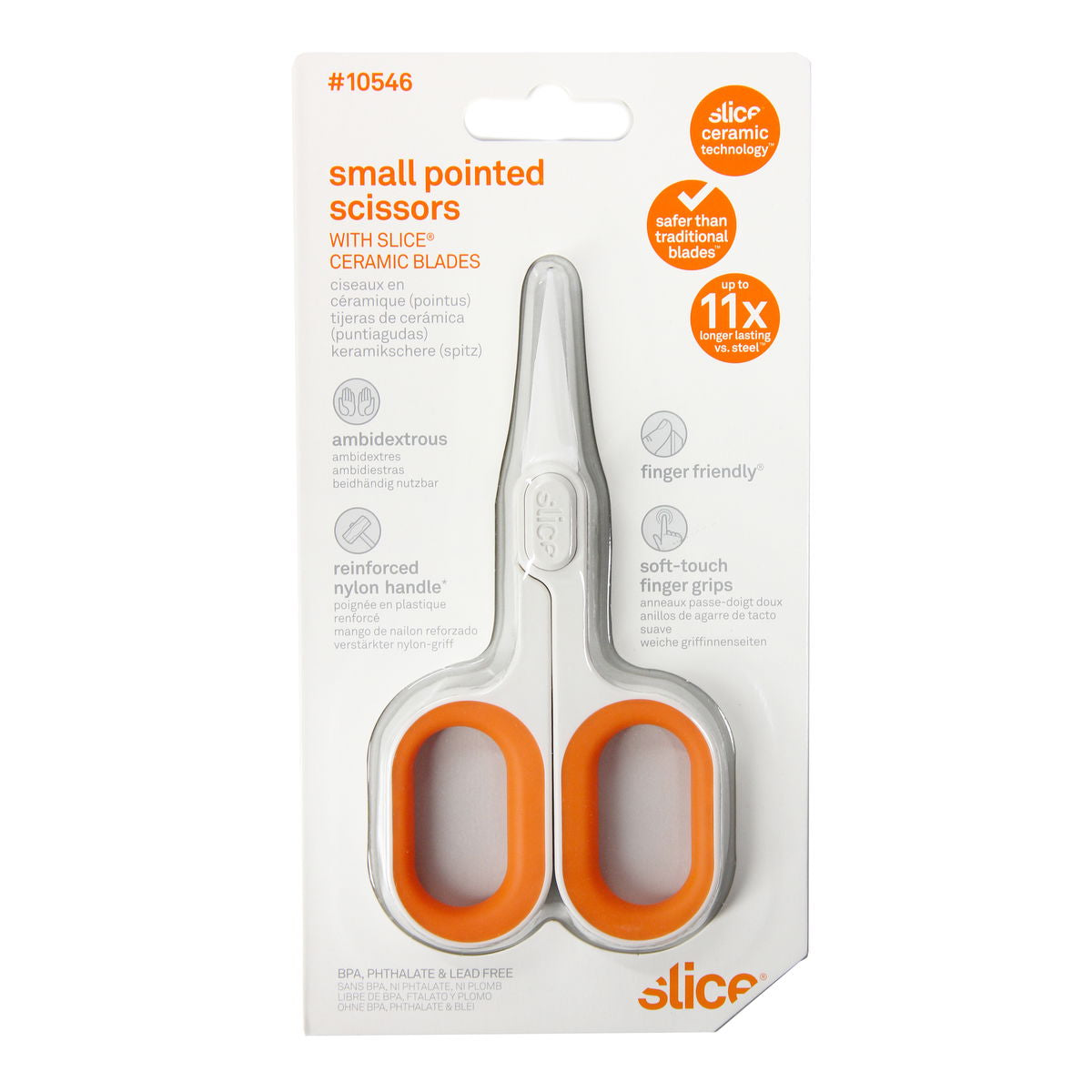 The Slice Small Pointed Scissors combine comfort and safety so you can cut easily and confidently. The tool has a lightweight, sturdy handle with soft-touch finger grips that fit perfectly in your left or right hand. Pointed-tip blades increase these highly portable scissors' effectiveness as you can easily puncture cutting material. However, the blade edges are safe to the touch due to their unique finger-friendly design. Slice remains the first choice for safety and effectiveness in industrial settings and is now recognized as the leading safety scissors in homes. Ideal for trimming indoor plants and flowers, sewing and crafting, and using for laboratory work - the Small Pointed Scissors make people and places safer. Finger-friendly blades are the only safety blade on the market/li> Lightweight design and soft-touch finger grips to maximize comfort/li> Pointed-tip blades so you can puncture cutting material if necessary/li> Suitable for left- and right-handed users/li> BPA-, phthalate-, and lead-free, so ideal for kitchen use/li> Slice blades last 11.2x longer than traditional blades