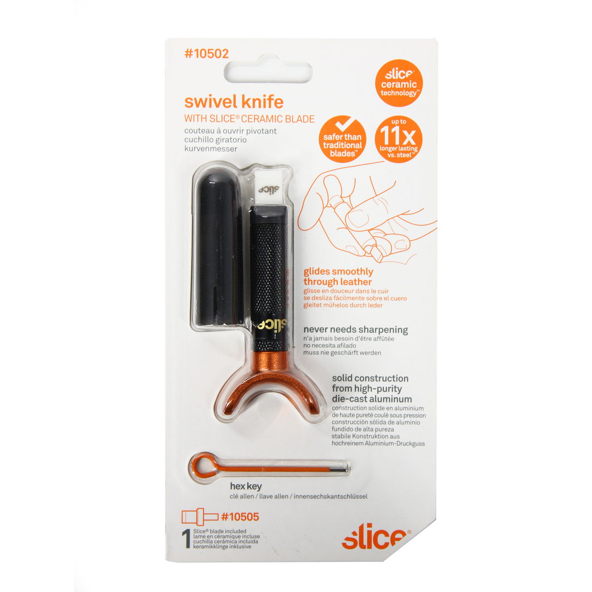 The Slice 10502 Swivel Knife was ergonomically co-designed with a master leathersmith to ensure it s the perfect tool for working with leather. You can easily adjust the height of the contoured saddle that swivels on ball bearings, and the cross-hatched grip adds additional comfort and control. It s built from solid aluminum to guarantee durability and has a finger-friendly blade (plus safety cap) to keep you safe. It s suitable for left- and right-handed users, and a blade-change hex key is conveniently included. Slice makes people and places safer, and the Swivel Knife makes outlining and cutting designs into the surface of leather as easy as possible. ,p> Adjustable contoured saddle and cross-hatched grip to maximize comfort Made from solid aluminum to ensure outstanding durability Suitable for left- and right-handed users Safety cap for additional protection Blade-change hex key included Finger-friendly blade is the only safety blade on the market Slice blades last 11.2x longer than traditional blades Great for: Outlining leather Cutting designs into the surface of leather Creating intricate details Holding for long periods without experiencing discomfort