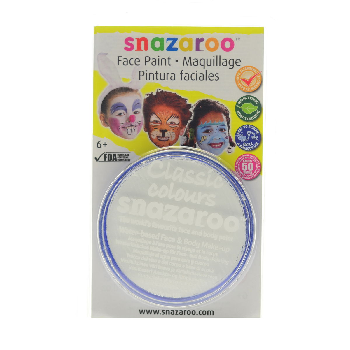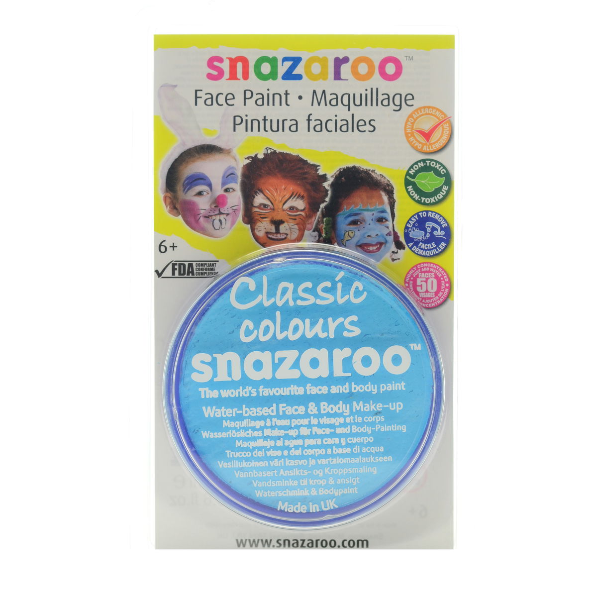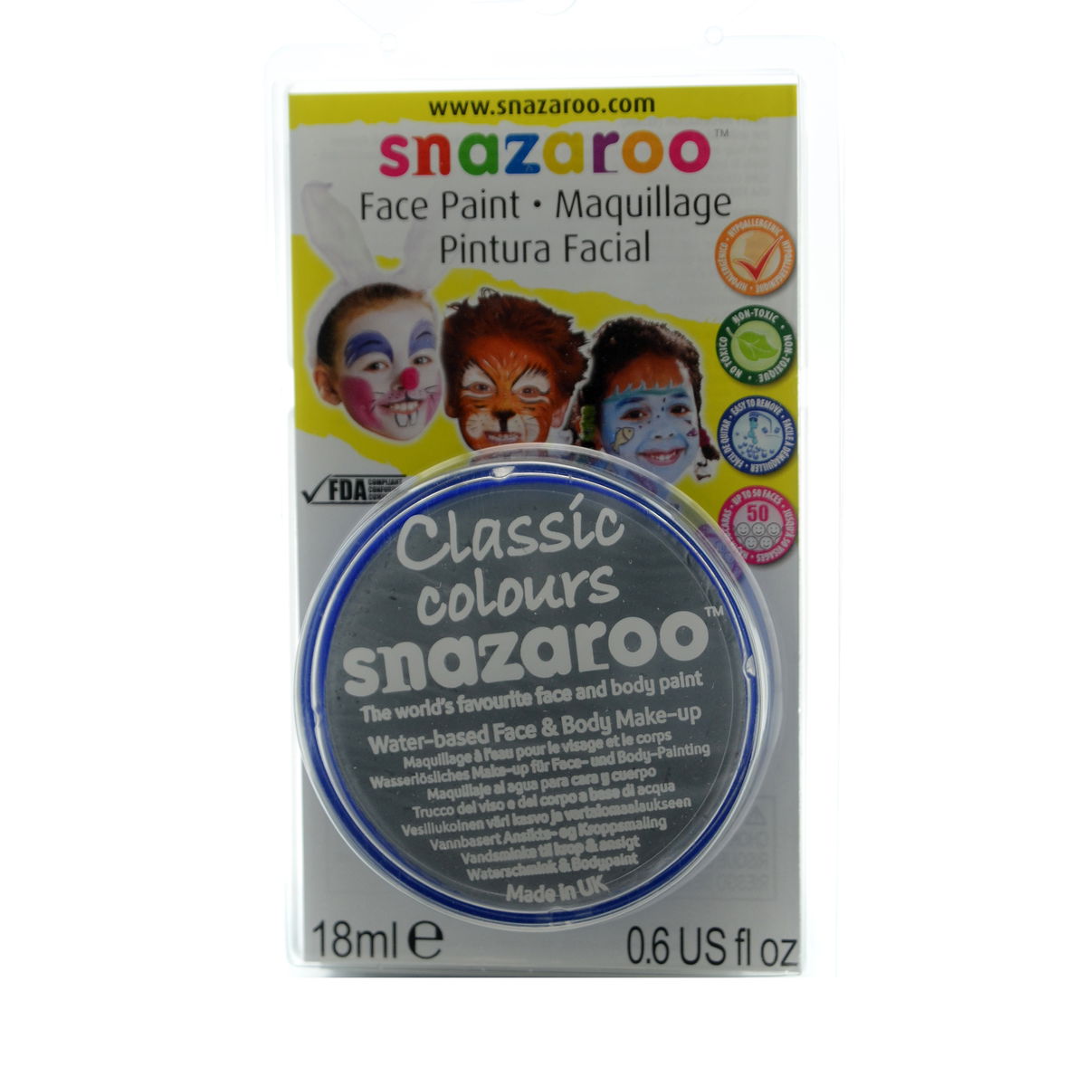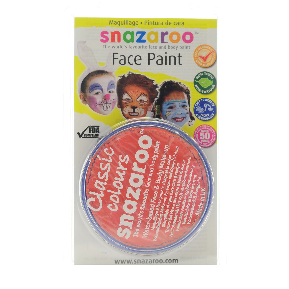 Snazaroo Face Paints are specifically formulated to be friendly to the most delicate skin and are fragrance free. They are completely safe, therefore you can rest assured they are manufactured using only approved ingredients fully compliant with EU and FDA toy and cosmetic regulations, and are completely non-toxic. They are available in a variety of vibrant colors that go on easily and dry quickly so you can easily complete a design in less than 5 minutes. Because Snazaroo Face Paints are water based, they are as easy to get off as they are to put on. Simply remove with soap and warm water; there is no need for scrubbing or harsh removers. Each color sold in a convenient 18 ml compact that will easily paint 50 full faces.