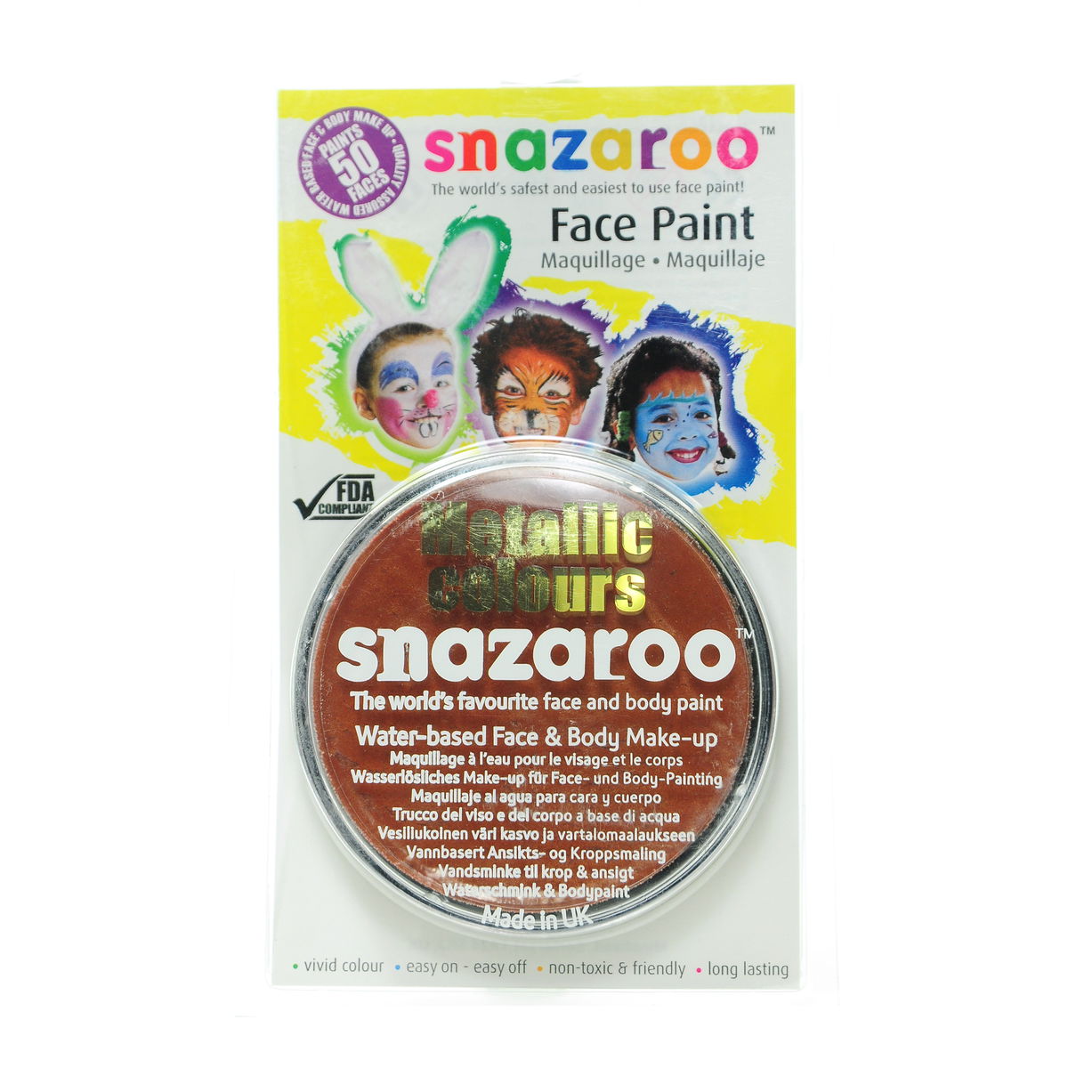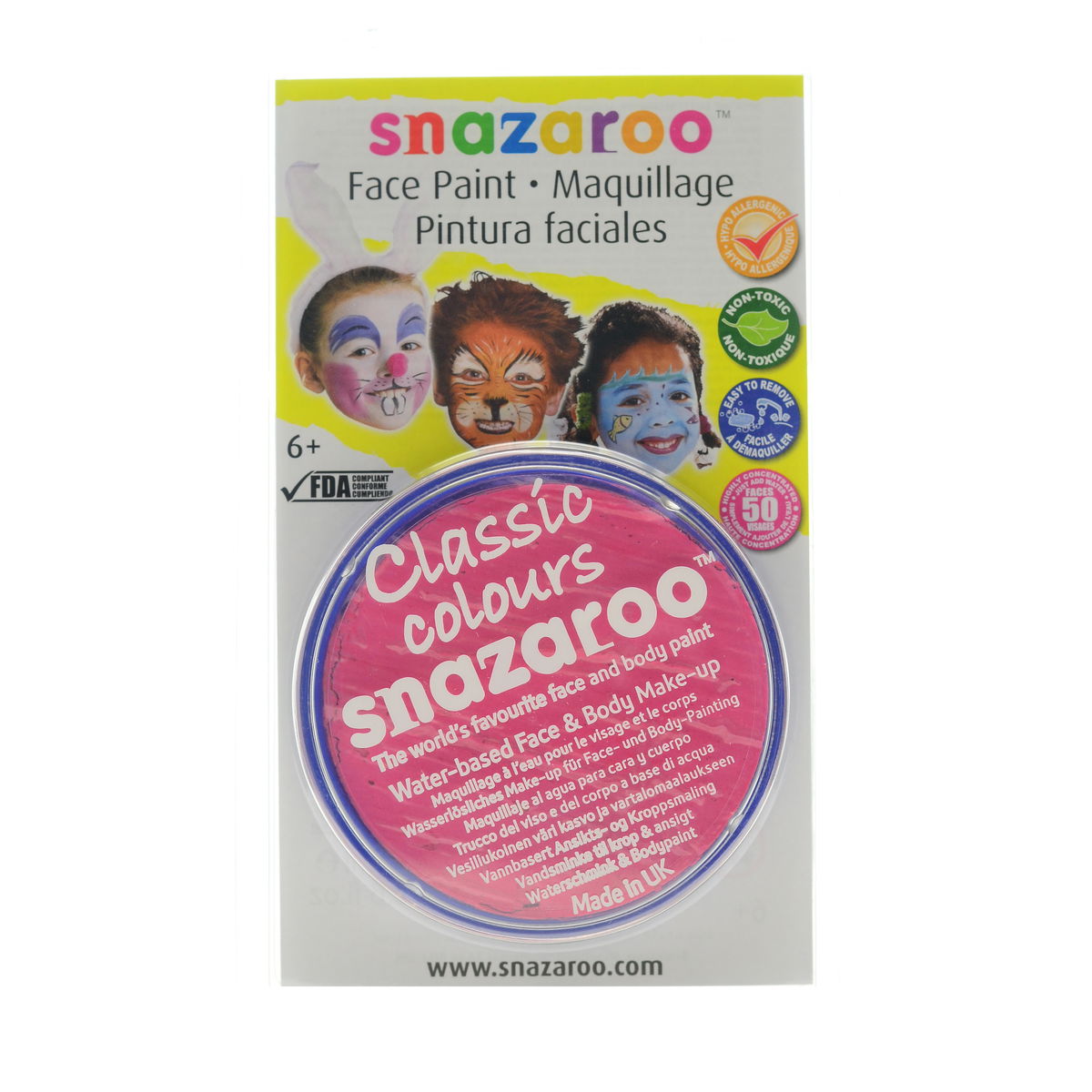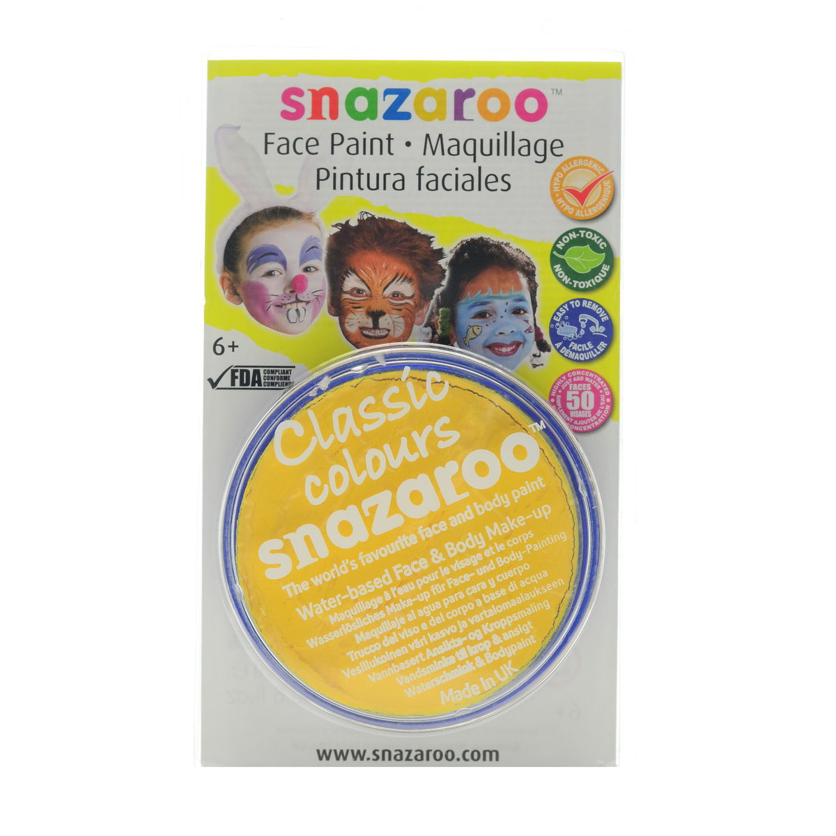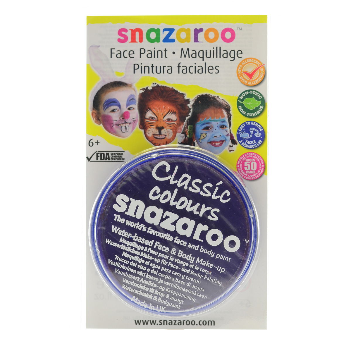 Snazaroo Face Paints are specifically formulated to be friendly to the most delicate skin and are fragrance free. They are completely safe, therefore you can rest assured they are manufactured using only approved ingredients fully compliant with EU and FDA toy and cosmetic regulations, and are completely non-toxic. They are available in a variety of vibrant colors that go on easily and dry quickly so you can easily complete a design in less than 5 minutes. Because Snazaroo Face Paints are water based, they are as easy to get off as they are to put on. Simply remove with soap and warm water; there is no need for scrubbing or harsh removers. Each color sold in a convenient 18 ml compact that will easily paint 50 full faces.