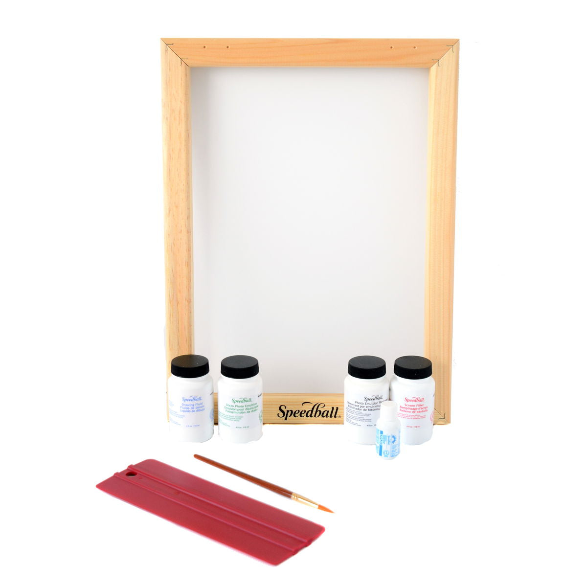 The perfect start-up set for anyone wanting to get involved in screen printing. Just add your favorite colors of Speedball ink and you're ready to go! Kit includes a 10 in. x 14 in. screen frame, fabric squeegee, 4 oz. bottle of screen filler, 4 oz. bottle of drawing fluid, 4 oz. bottle of Diazo Photo Emulsion, 1/2 gram of Diazo Sensitizer, no. 6 round brush, and instruction book.