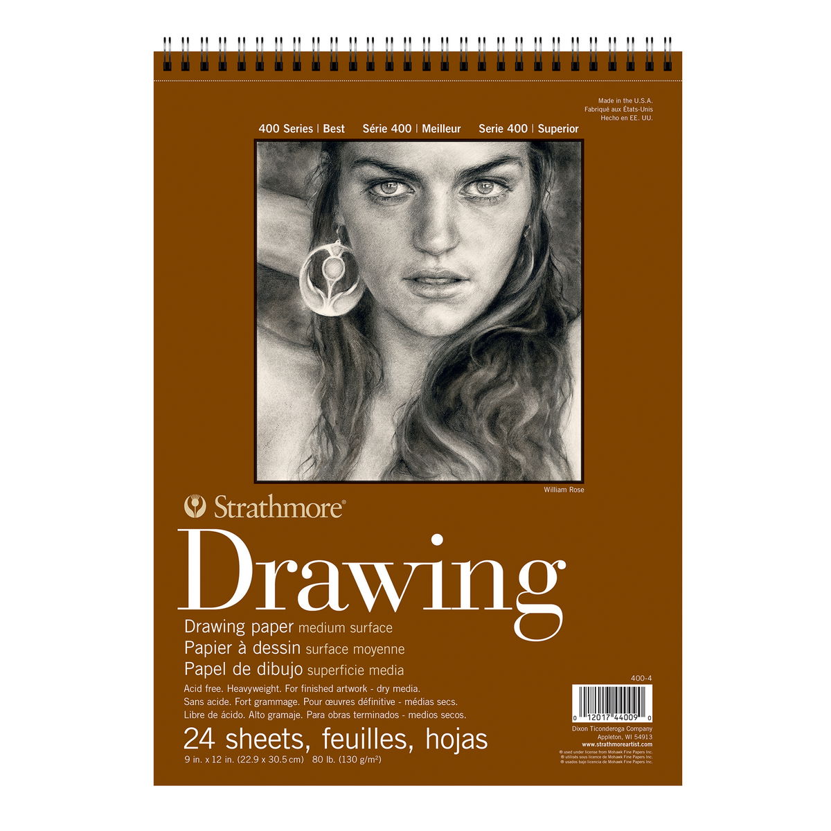 Strathmore 400 Series drawing paper pads contain acid-free, heavy weight, durable, medium surface 80 lb. drawing paper. Natural white paper is ideal for illustrations and final drawings. Suitable for any dry media, pen, ink, and light washes. Pads contain 24 sheets and are spiral bound across the top (the first measurement listed). Pads 8 in. x 10 in. and larger are micro-perforated for clean and easy sheet removal.
