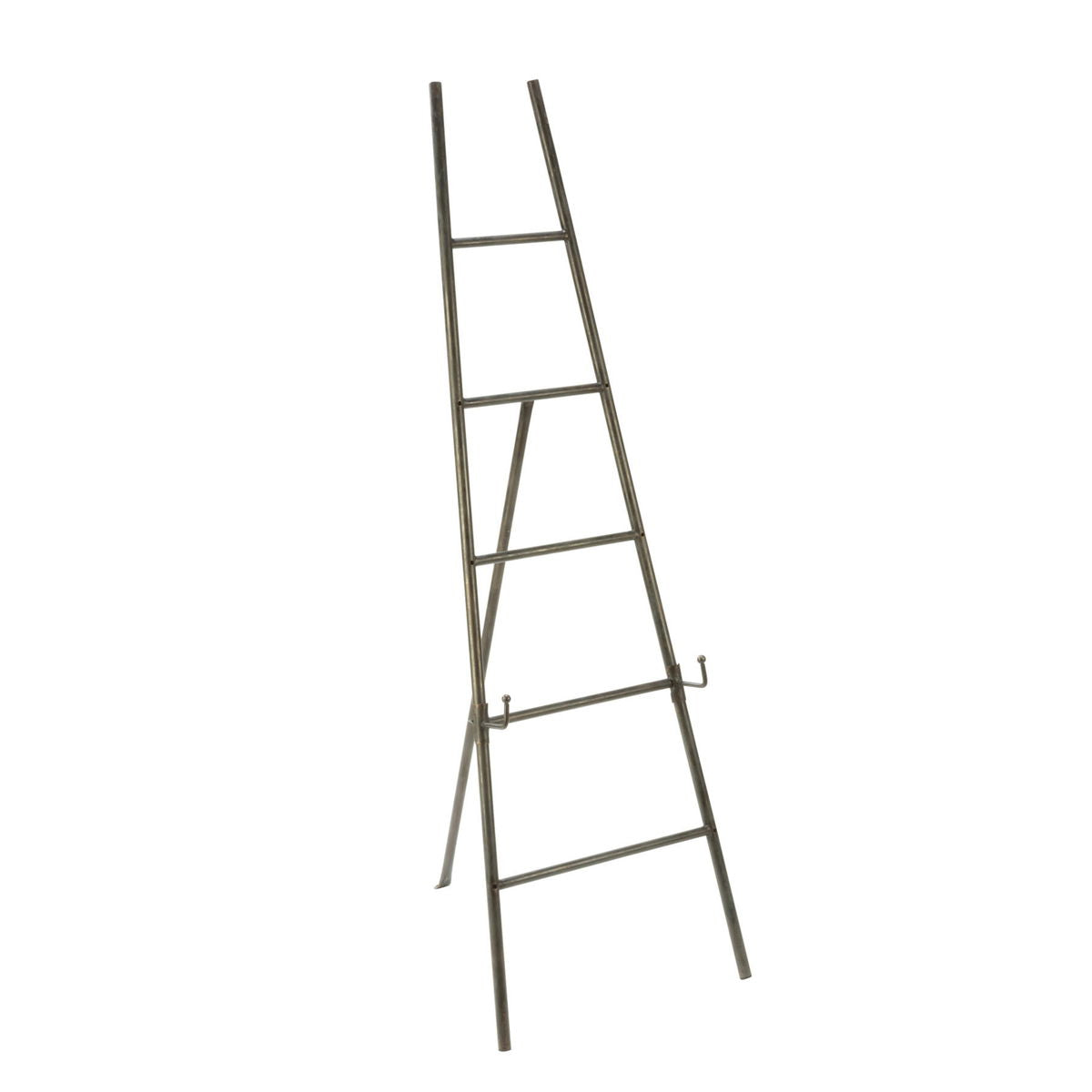 The Tripar Ladder Floor Easel in black offers multiple display options. Use the 5 ladder rungs for hanging display or choose the set of adjustable brackets. The brackets have a lip depth of 2.25 in. The easel measures 54 in. h x 18.8 in. w x 25 in. d.