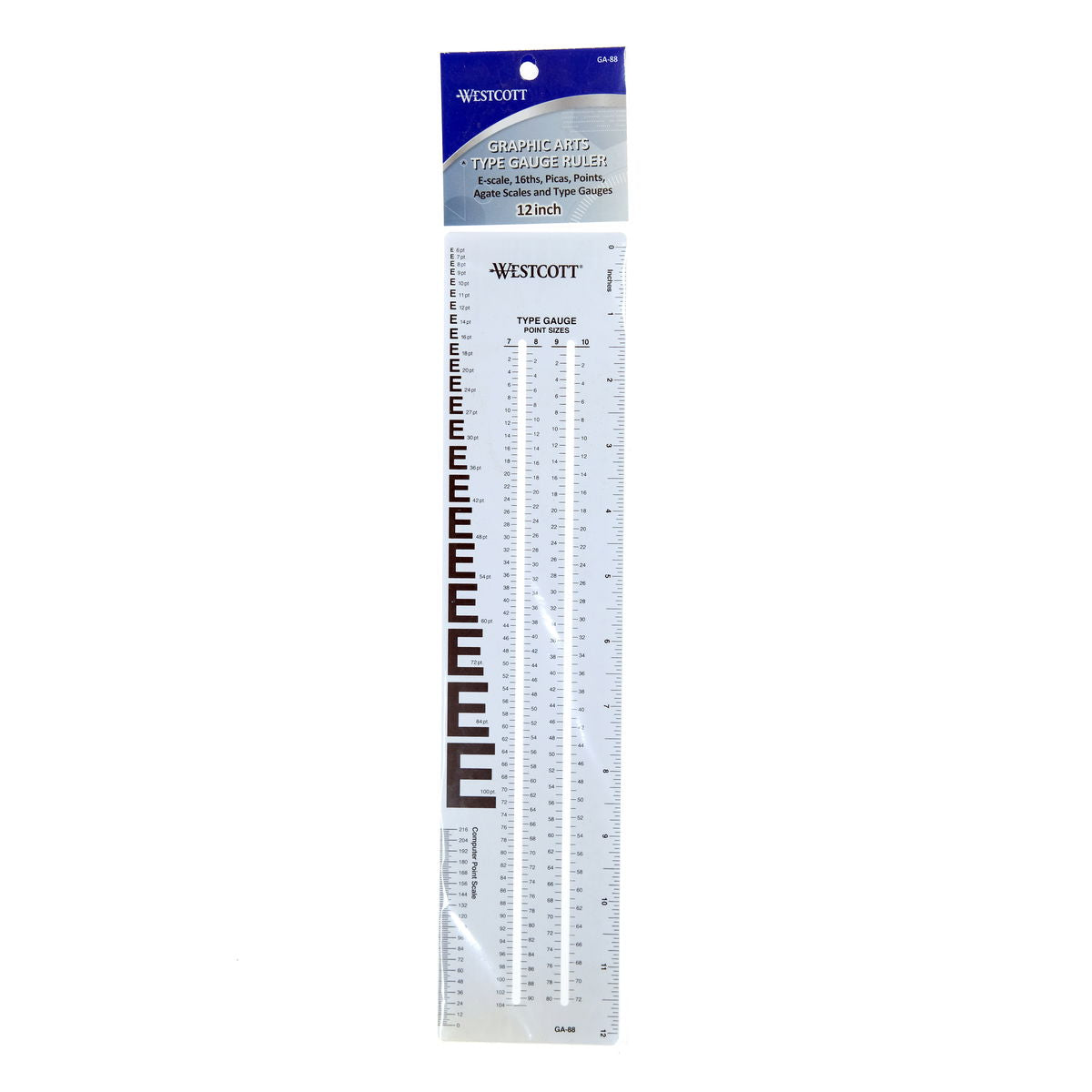 Opaque rulers printed on both sides to include all the scales needed. Features precision cut slots to keep scales flush for easy measurement. Rulers have an inch scale and pica scale, agate scale, E-scale chart, printers point size scale, ten line rules - hairline to 24 point.