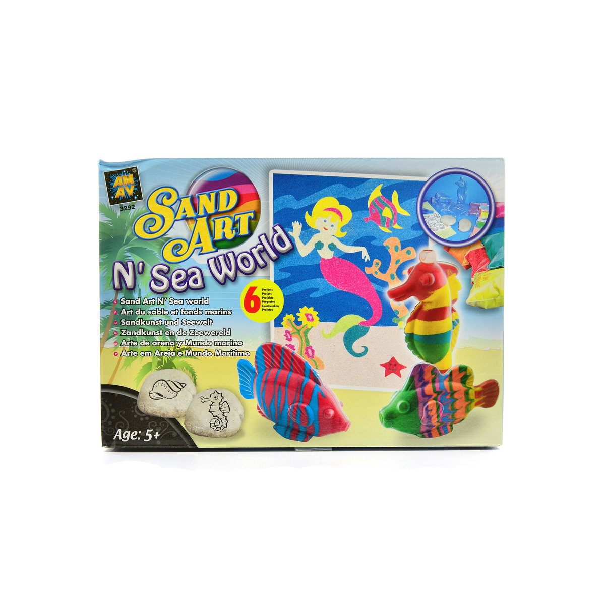 Fun in the sand, without even visiting the beach! The Sand Art n' Sea World Kit includes everything needed to make an assortment of ocean themed decorations, such as colorful sand sculpture, sand art posters, and decorated stones. Sand Art n' Sea World Kit includes:Ocean Themed Plastic BottlesBags of Colored SandSand Art PaperStonesTattoo SheetFunnelScoopBendable StrawInstructionsAges 5+