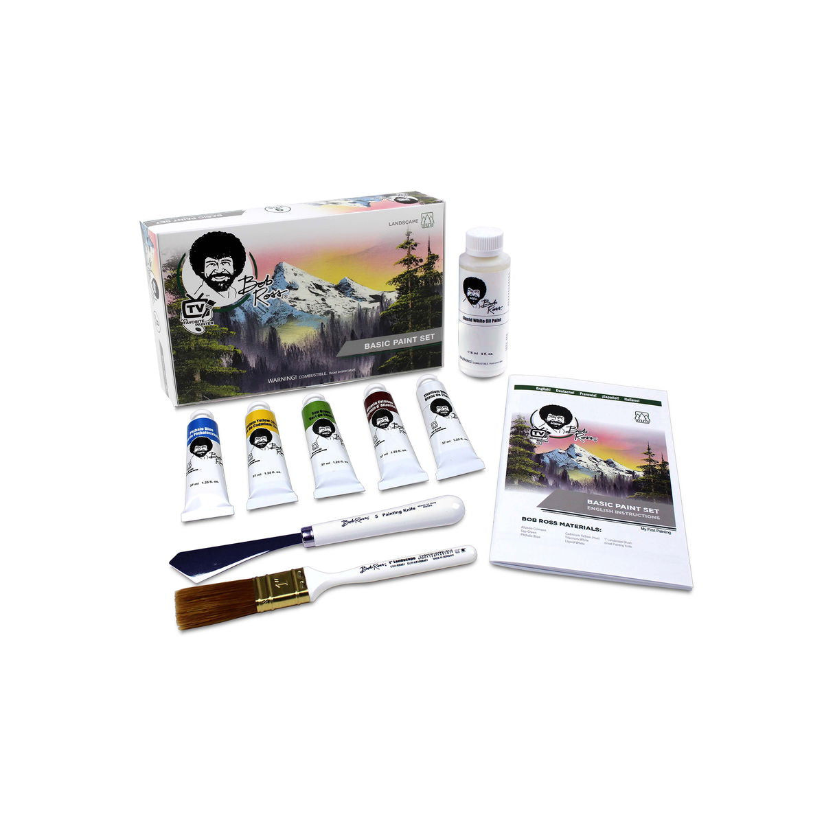 Un set ideal para empezar a aprender los métodos Bob Ross. Contiene cinco tubos de 37 ml de óleos Bob Ross, incluyendo carmesí de alizarina, amarillo de cadmio, azul ftalo, verde savia y blanco de titanio; una botella de 118 ml de blanco líquido Bob Ross; una espátula de detalle Bob Ross n.° 5; y un pincel de paisajismo Bob Ross n.° 1. Incluye instrucciones detalladas.