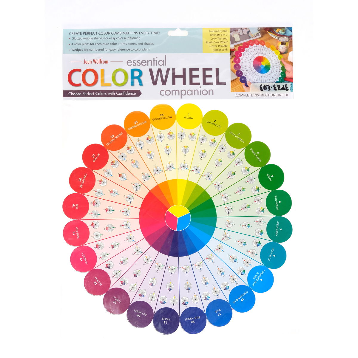 La rueda de color de Joen Wolfrom elimina las conjeturas que dificultan la elección de paletas. Esta herramienta de doble cara presenta 24 colores puros en una sola cara, cada una con cuatro ruedas de colores esenciales que muestran combinaciones armoniosas de un vistazo. Dale la vuelta para encontrar gamas graduadas de tintes, matices y tonos para cada tono: la información práctica que necesitas al mezclar pinturas o combinar colores de telas.