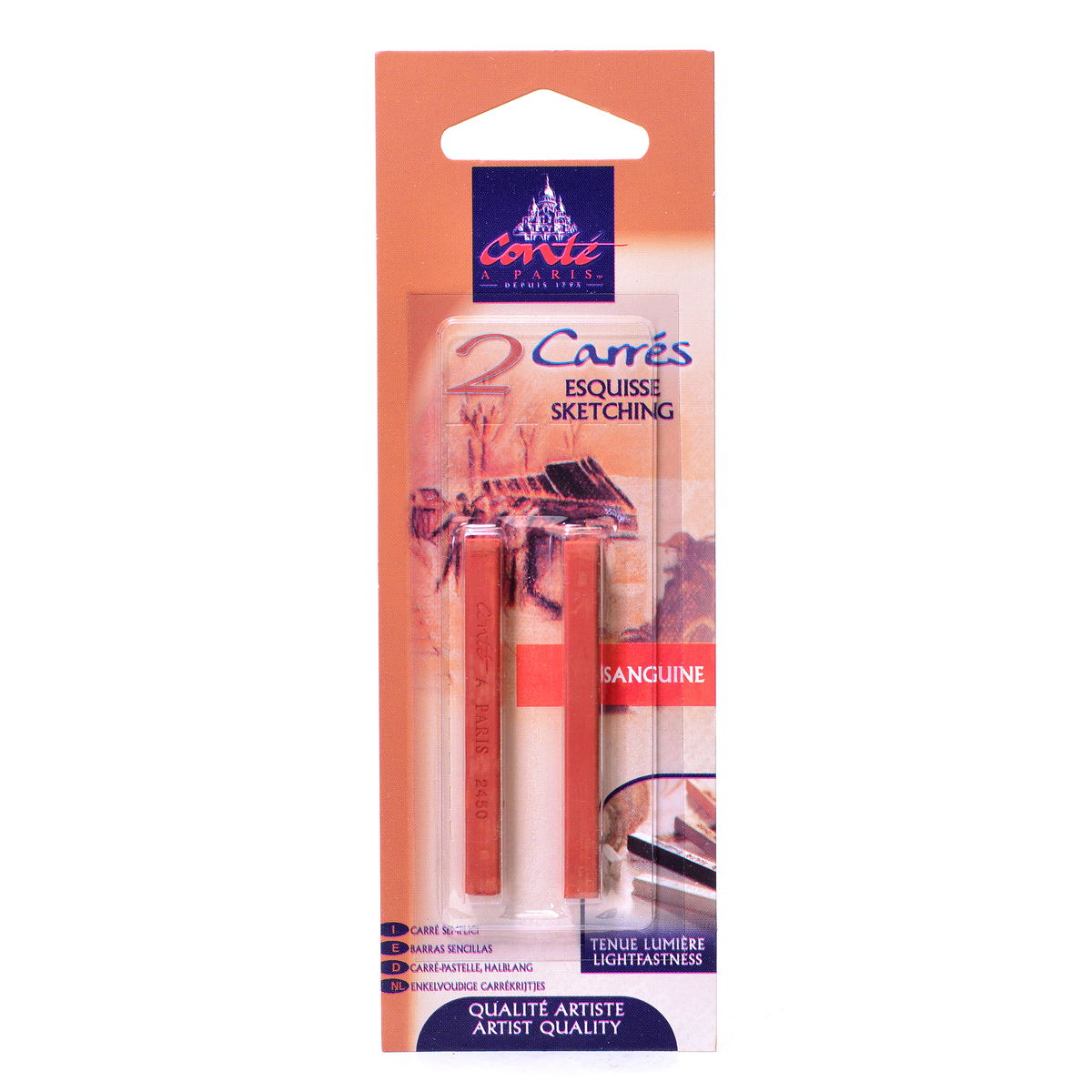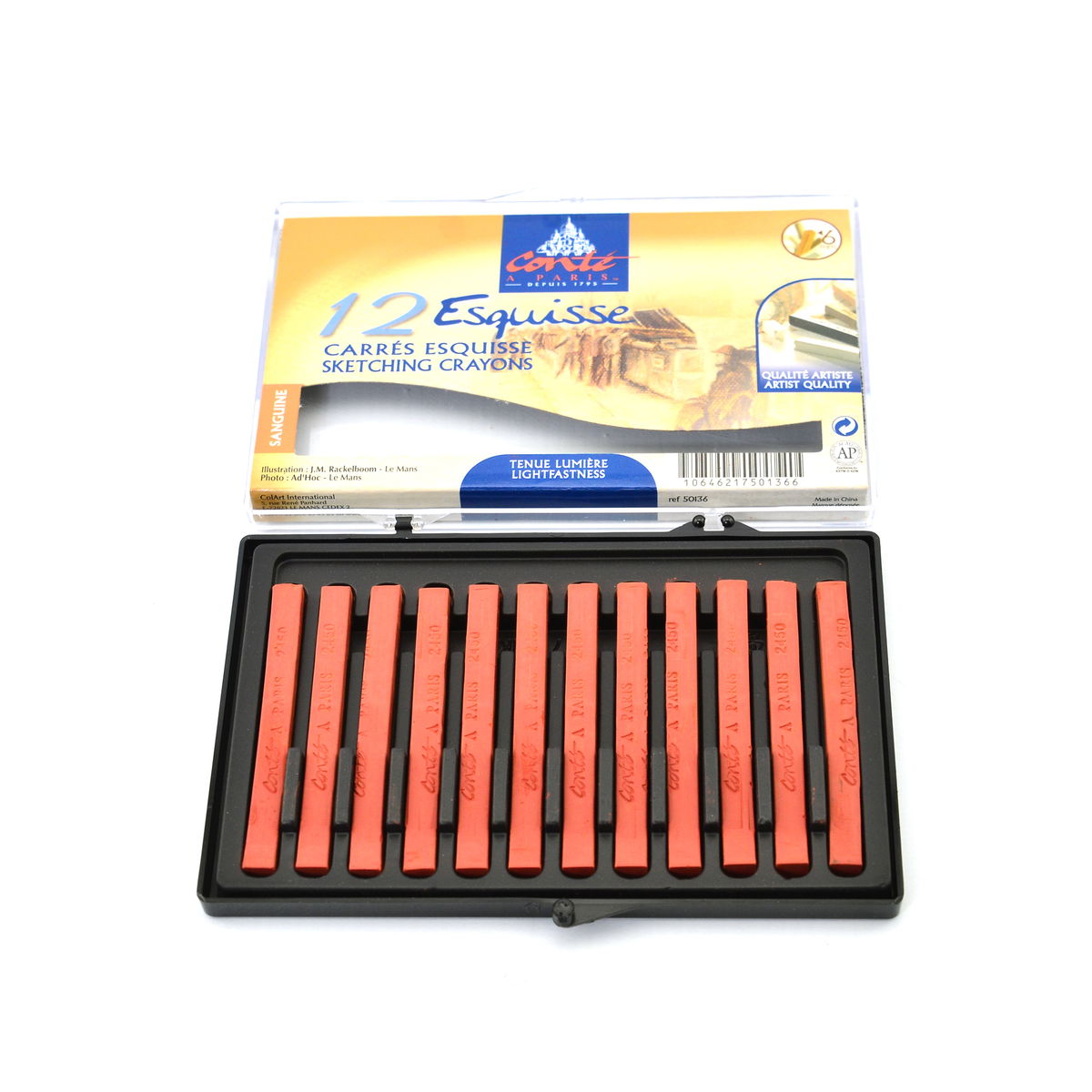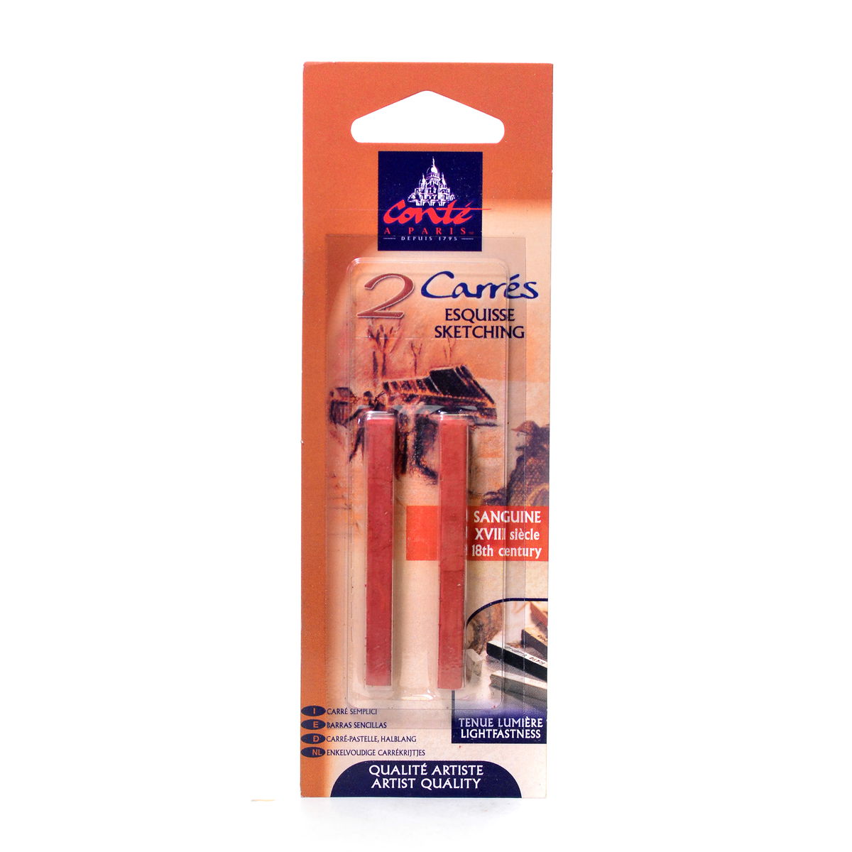 Los pigmentos densos y cerosos proporcionan una rica opacidad que se aprecia a la perfección en papeles tonificados y oscuros, crucial para la técnica tradicional de los tres crayones y para el trabajo contemporáneo con técnicas mixtas. El blanco y el negro están disponibles en tres grados de dureza (HB, B, 2B) para diferentes necesidades de trazo; las sanguinas y los tonos tierra se corresponden con la dureza B. La gama sanguina ofrece una calidez matizada: el Natural es el más claro, el XVIII se intensifica ligeramente, el Watteau añade más óxido rojo y el Sanguine Medicis es el más oscuro y saturado. El Bistre proporciona un marrón terroso profundo. El gris se sitúa en un valor intermedio.