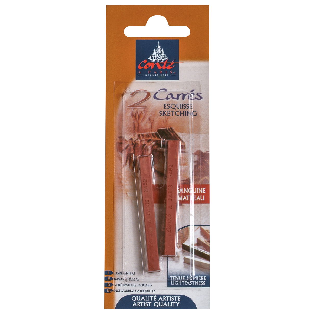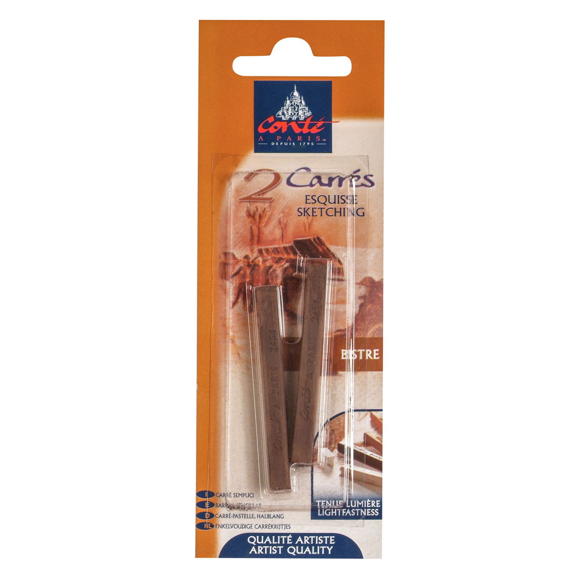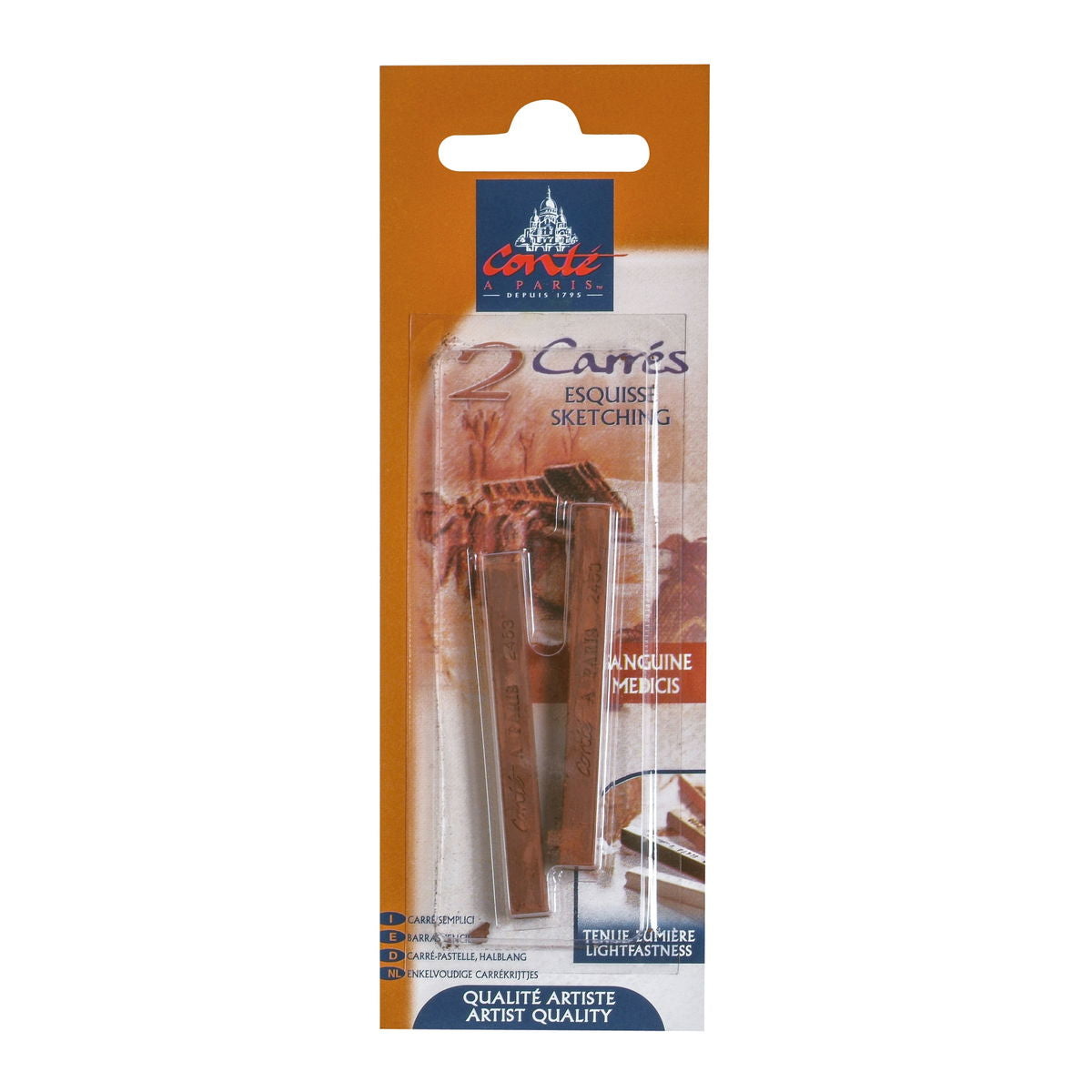 Los pigmentos densos y cerosos proporcionan una rica opacidad que se aprecia a la perfección en papeles tonificados y oscuros, crucial para la técnica tradicional de los tres crayones y para el trabajo contemporáneo con técnicas mixtas. El blanco y el negro están disponibles en tres grados de dureza (HB, B, 2B) para diferentes necesidades de trazo; las sanguinas y los tonos tierra se corresponden con la dureza B. La gama sanguina ofrece una calidez matizada: el Natural es el más claro, el XVIII se intensifica ligeramente, el Watteau añade más óxido rojo y el Sanguine Medicis es el más oscuro y saturado. El Bistre proporciona un marrón terroso profundo. El gris se sitúa en un valor intermedio.