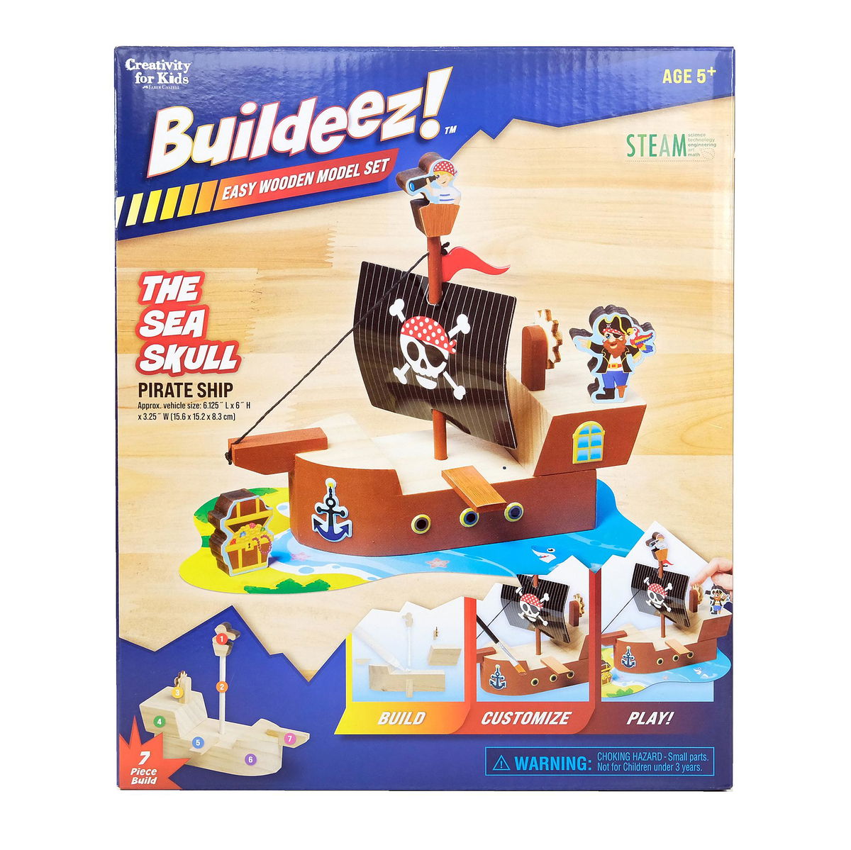 ¡Los niños pueden embarcarse en una aventura pirata construyendo su propio barco pirata de juguete con Buildeez! Contenido: 7 piezas de madera para maqueta de barco pirata, incluyendo la cofa de vigía, 1 cofre del tesoro de madera, 1 pirata de madera, pegatinas surtidas, 1 vela con calavera y huesos cruzados y cuerda, 1 pincel, 1 esponja, 1 tubo de pegamento para manualidades, 1 tubo de pintura acrílica marrón de 0.16 fl. oz, tapete de exhibición en el empaque e instrucciones. A partir de 5 años.