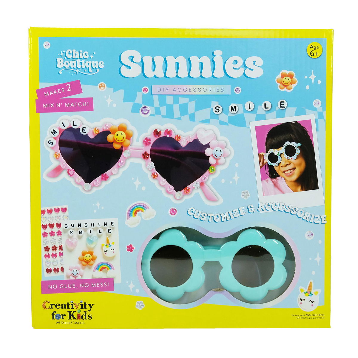 Saca tu lado fashionista decorando dos gafas de sol. Es facilísimo personalizar y adornar tus gafas de sol con forma de corazón y flor con cuentas de letras, pedrería y dijes. Incluye: gafas de sol con forma de flor, gafas de sol con forma de corazón, pedrería adhesiva, perlas y láminas de dijes. A partir de 6 años.