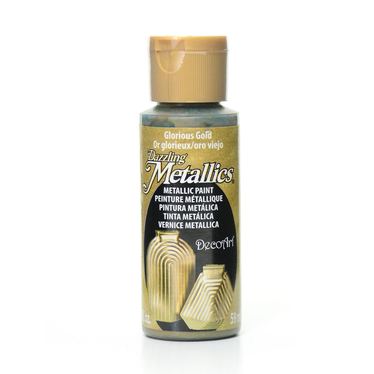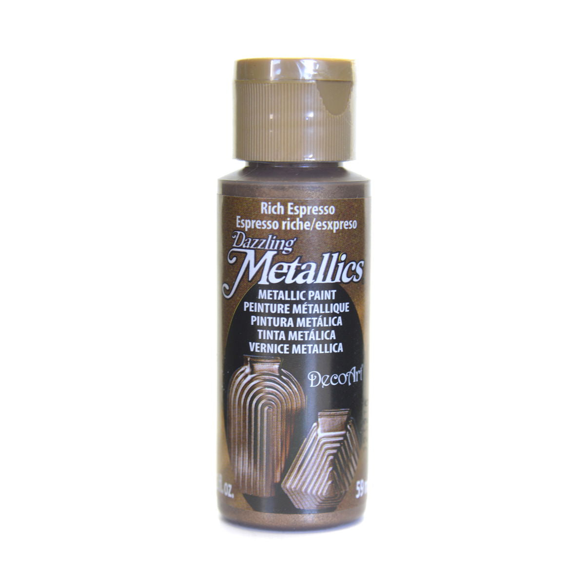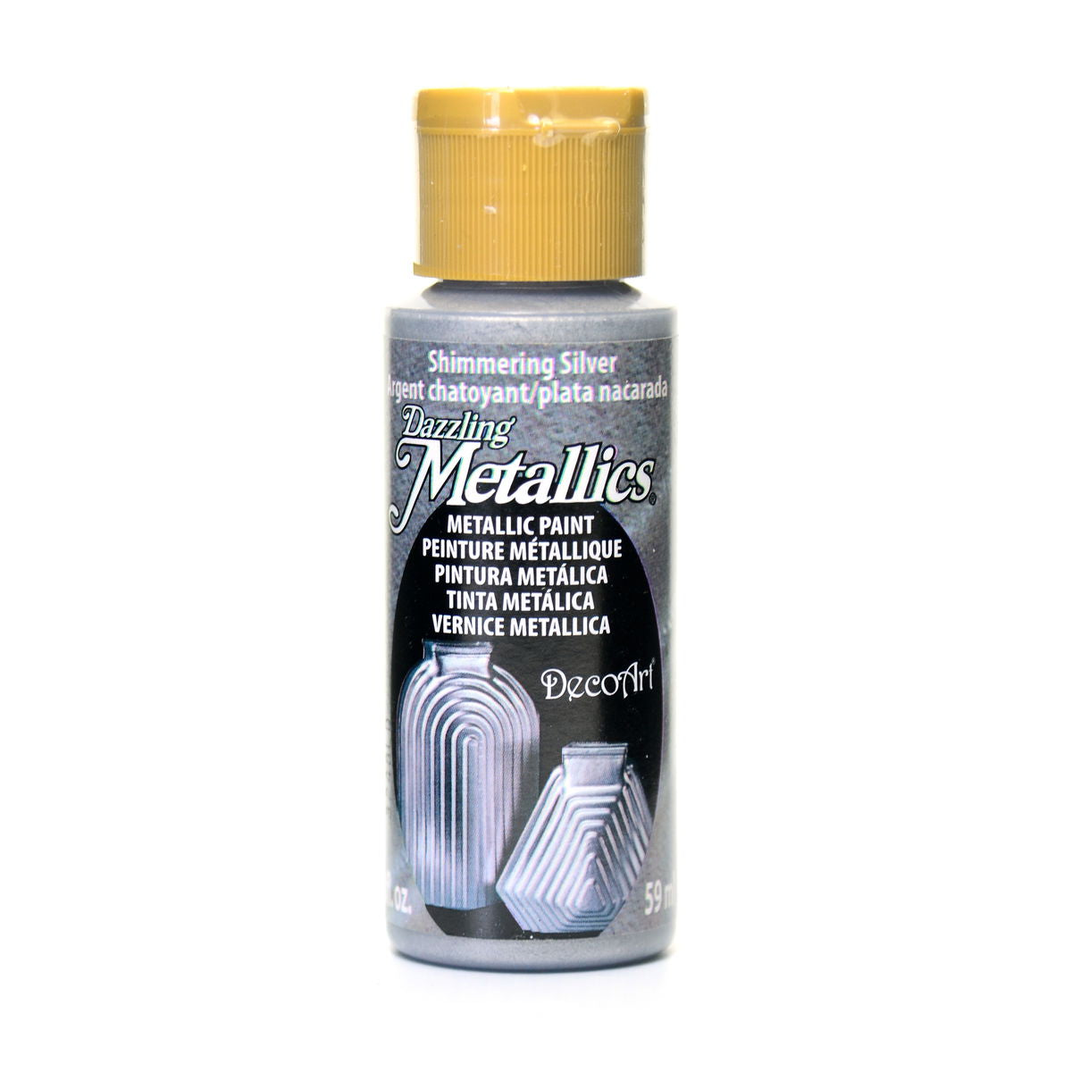 Las escamas de metal real suspendidas en acrílico crean un brillo metálico genuino en lugar de un brillo simulado. Esto es importante cuando se necesitan detalles reflectantes que capturen la luz como el metal real, sin un sustituto perlado mate. DecoArt muele las escamas lo suficientemente finas para que fluyan suavemente desde las botellas flexibles, manteniendo una opacidad que cubre en menos capas que las pinturas metálicas para manualidades típicas.
