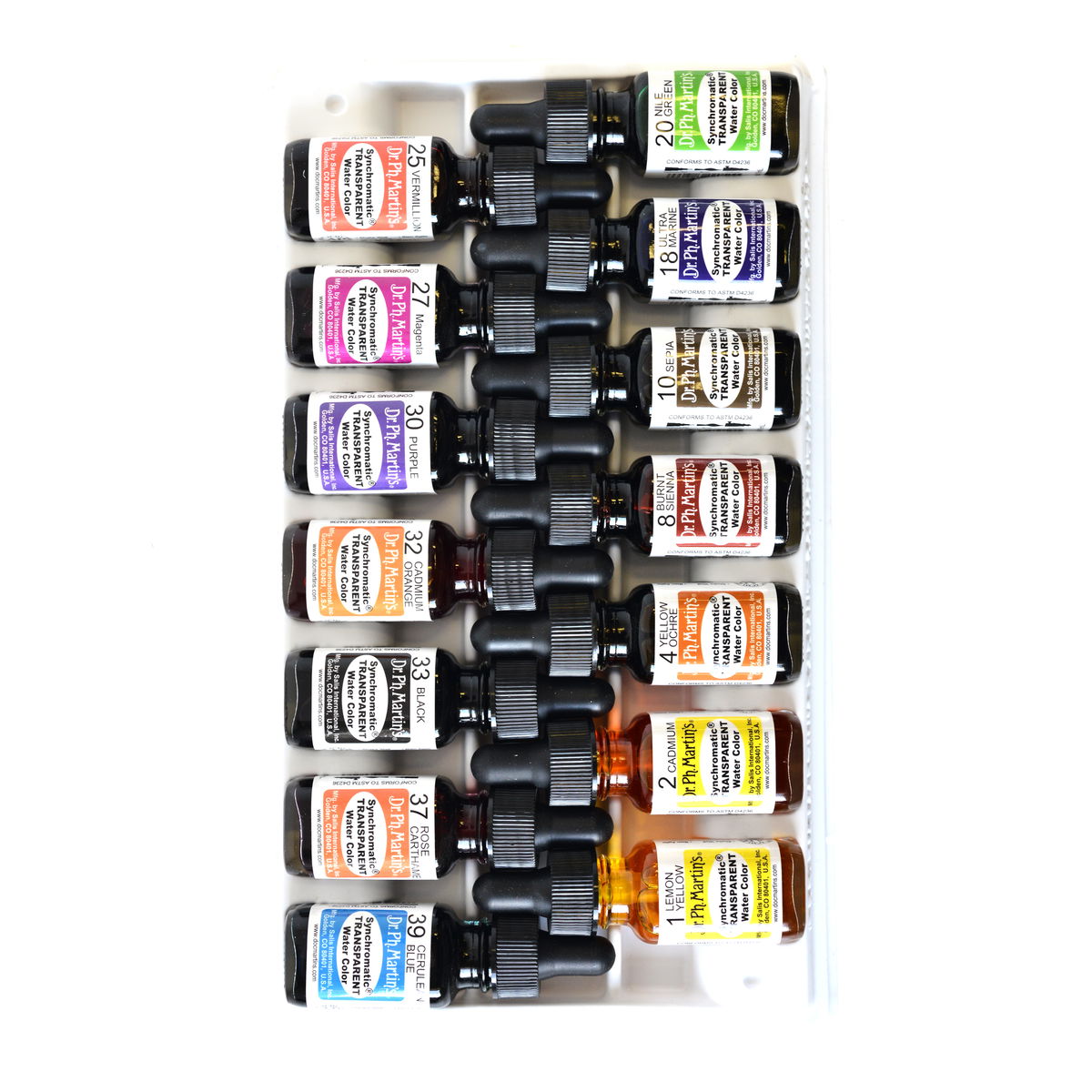 Las acuarelas transparentes en frascos con cuentagotas eliminan las dudas al mezclar la paleta, manteniendo las características tradicionales de los pigmentos. Las tintas Synchromatic del Dr. Ph. Martin ofrecen un color intenso y luminoso que fluye suavemente con el pincel o la pluma, ideal para trabajos de ilustración que exigen precisión y vitalidad. Este set de catorce colores para estudiantes abarca desde los primarios esenciales hasta los tonos tierra, del amarillo limón al ultramar, del siena tostado al azul cerúleo, proporcionando una paleta de trabajo completa para estudios, bocetos y piezas terminadas.