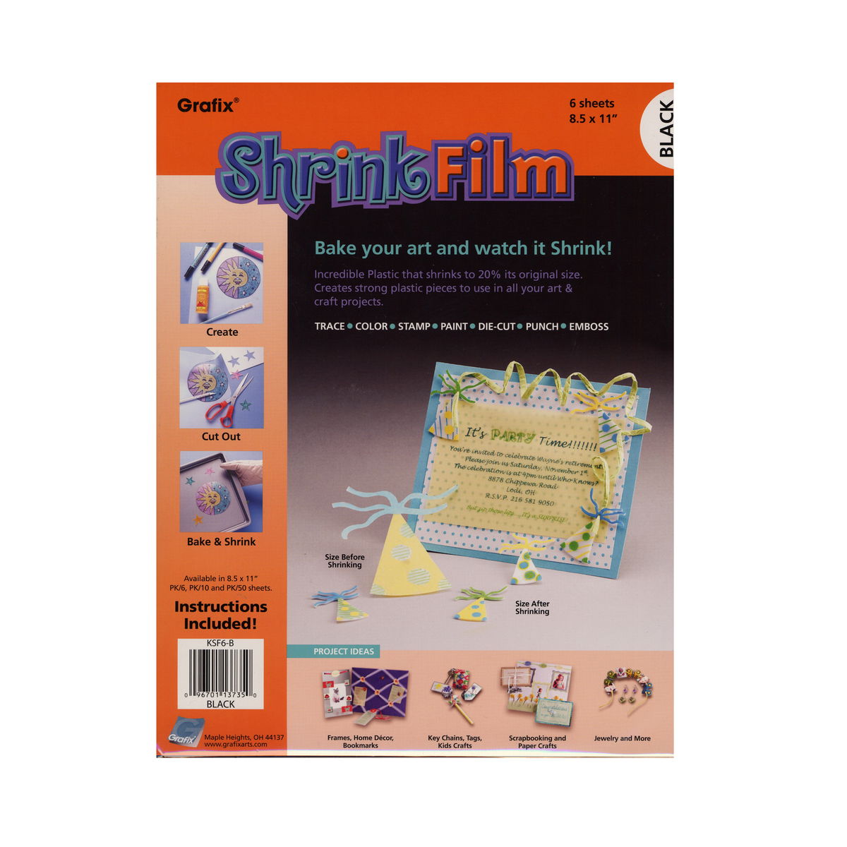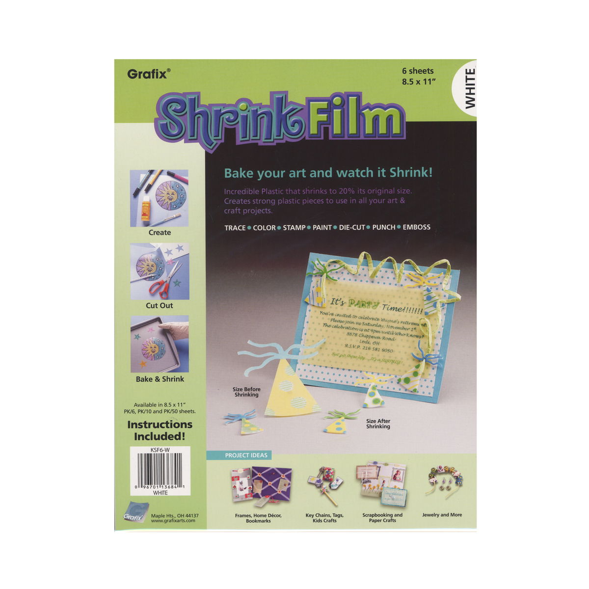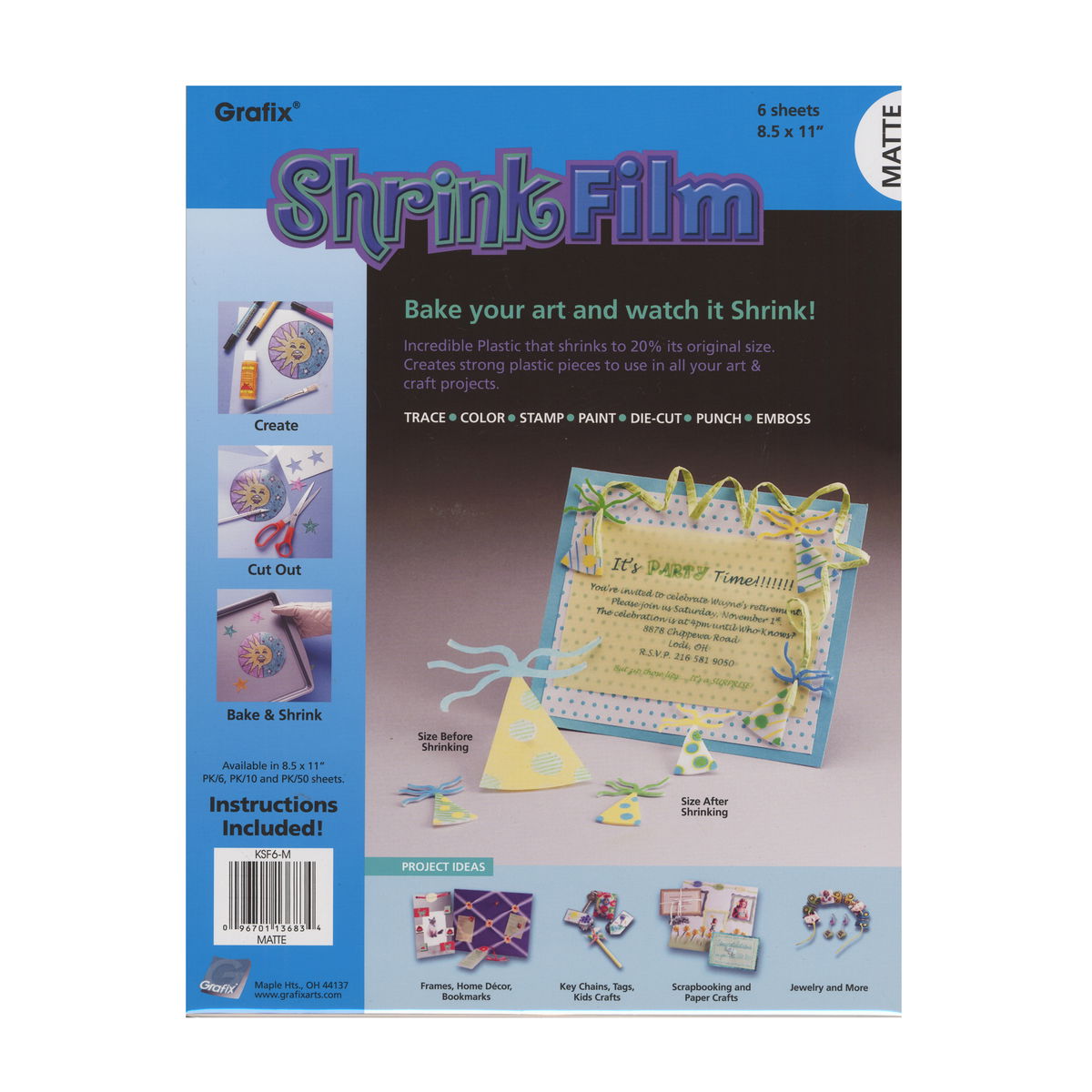 Solo dibuja, corta y hornea, eso es todo lo que tendrás que hacer con las películas retráctiles Grafix. Aplica el diseño a la hoja (dibuja, traza o estampa con goma), coloréalo, recórtalo y hornéalo en el horno para un nuevo proyecto de manualidades personalizado, limpio, colorido y divertido. Ideal para crear joyas únicas, miniaturas, adornos, tarjetas de felicitación, marcapáginas, arte de etiquetas o atados de paquetes, llaveros y mucho más. Ideal para niños (con supervisión de un adulto), adolescentes y adultos. Prueba primero los colores para la permanencia en un trozo de película sobrante, prueba con pinturas acrílicas a base de agua, lápices/bolígrafos, tinta o pinturas termoendurecibles. Lijar la superficie (de grano 280 a 320) ayuda a adherir el color a la película retráctil al estampar con goma o para diseños que se lavarán o usarán con frecuencia. Paquetes de 10 hojas de 8 1/2 pulg. x 11 pulg.