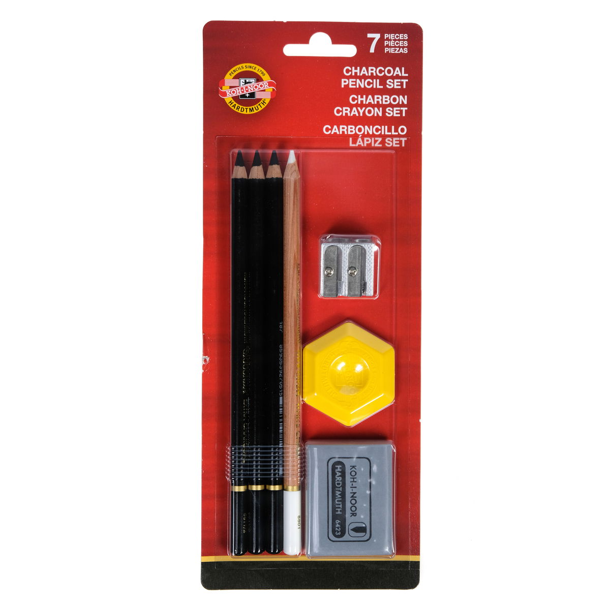 Los lápices de carboncillo Koh-I-Noor son conocidos por su color uniforme, ideal para dibujar y esbozar sobre superficies lisas y rugosas. Este set de dibujo de 7 piezas incluye 3 lápices de carboncillo (blando, medio y duro), 1 lápiz de tiza blanca Gioconda, 1 borrador amasable, 1 borrador hexagonal de plástico y 1 sacapuntas metálico doble.
