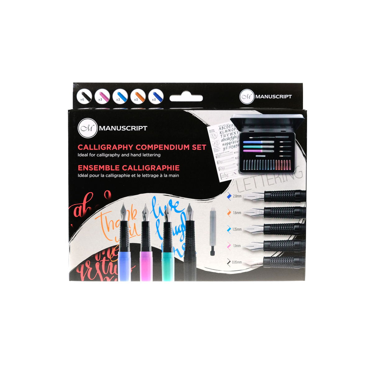 El compendio de caligrafía de Manuscript es perfecto para el calígrafo principiante. Contiene todo lo necesario para crear hermosas caligrafías, incluyendo una introducción paso a paso a esta disciplina. El compendio de caligrafía de 30 piezas incluye: 4 plumas, 5 secciones de plumín, 18 cartuchos (colores surtidos), 1 convertidor de tinta, manual de instrucciones y papel de práctica.