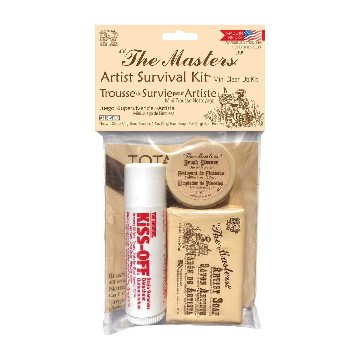 Manos y pinceles manchados de pintura que necesitan limpieza antes de la siguiente tarea. Este kit compacto incluye tres soluciones de limpieza Masters en un paquete portátil que abarca ambas necesidades. El quitamanchas Kiss-Off elimina las manchas de tinta y tinte en la piel; el jabón de manos elimina las manchas de pigmento difíciles de los dedos; y el limpiador de pinceles restaura las cerdas después de trabajar con acuarelas, óleos o acrílicos.