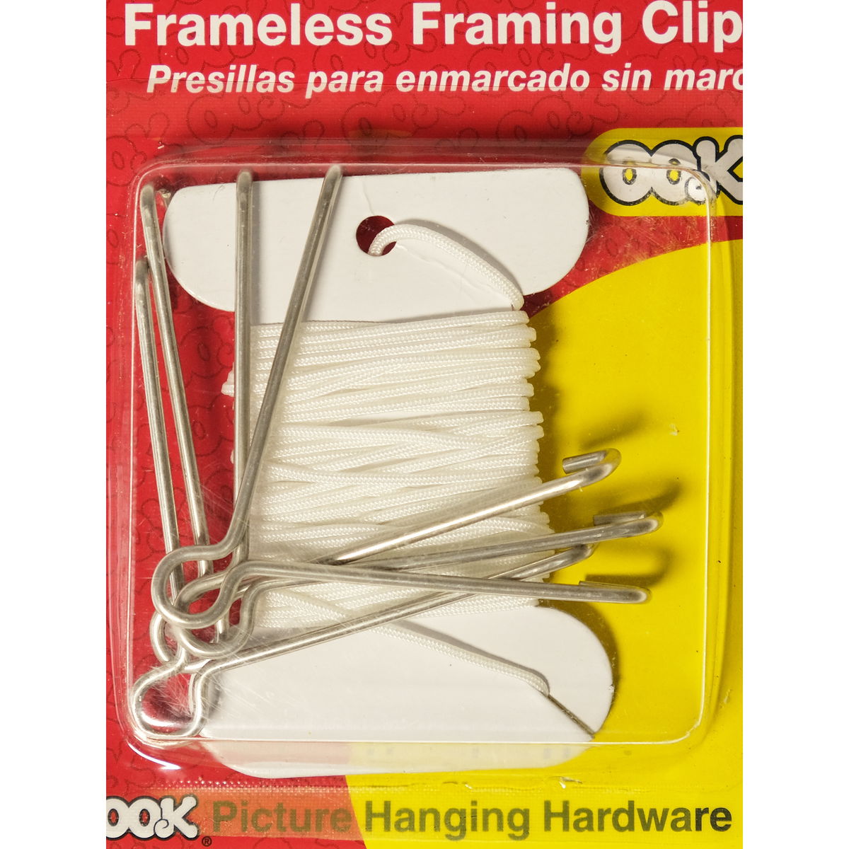 Los resistentes clips sin marco OOK permiten enmarcar cualquier obra de arte de hasta 66 x 66 cm sin necesidad de marco. Simplemente coloque los clips en cada esquina de la obra, en la parte posterior. Luego, pase un cordón o alambre por cada clip y tire con fuerza. ¡Listo! ¡Su obra está lista para exhibir!