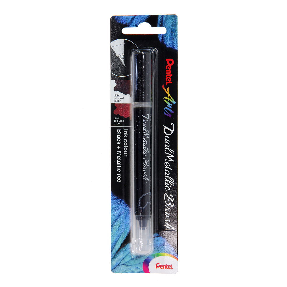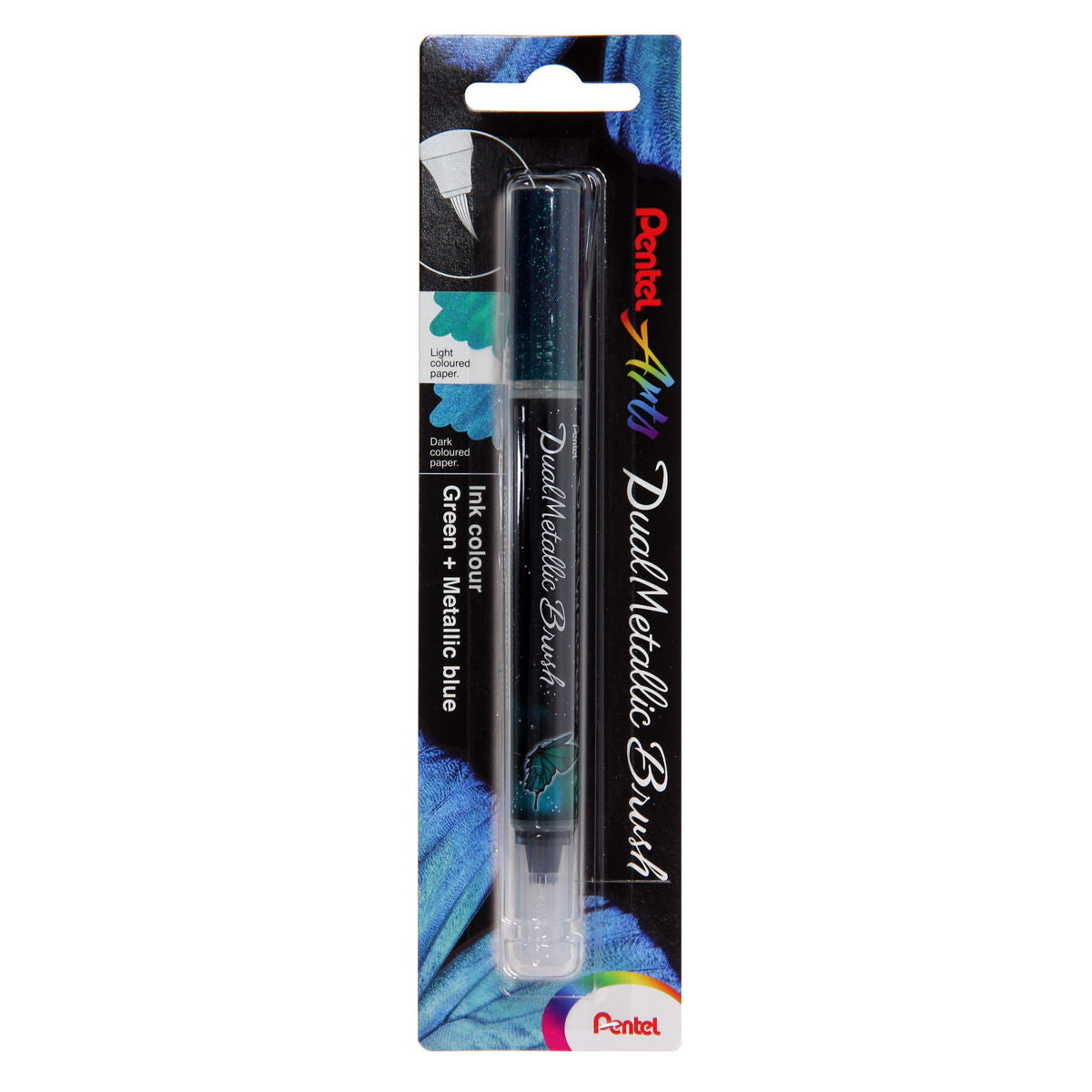 Las tintas metálicas suelen asentarse sobre la superficie del papel en lugar de penetrar las fibras, lo que modifica la interacción de la luz con las marcas. Pentel combina tinta de color con partículas metálicas en estos rotuladores de pincel, creando efectos de doble tono que cambian según el ángulo de visión. Un mismo trazo se lee de forma diferente bajo luz directa que en condiciones ambientales, lo que añade calidad dimensional a las superficies planas.