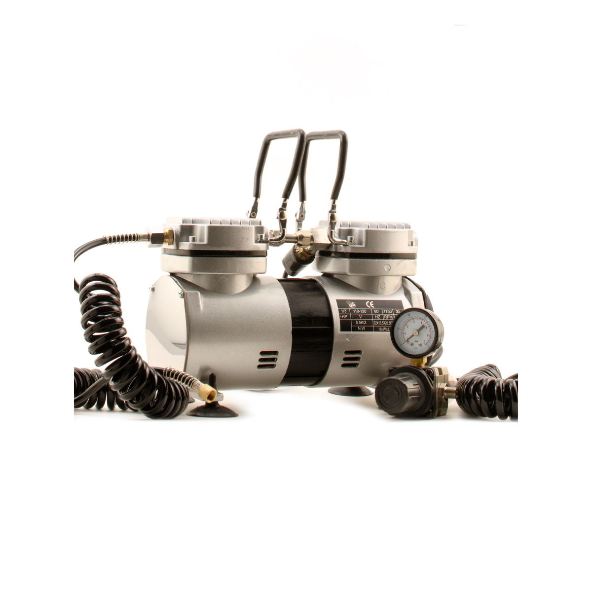 El diseño de doble pistón proporciona un flujo de aire constante a presiones de trabajo de hasta 55 psi, potencia suficiente para trabajos de detalle en una cobertura más amplia sin el volumen de los compresores de estudio más grandes. El Scorpion II mantiene 1,10 cfm a máxima presión, lo que proporciona un rendimiento constante tanto para aerografiar líneas finas como para crear gradaciones suaves en superficies más grandes.