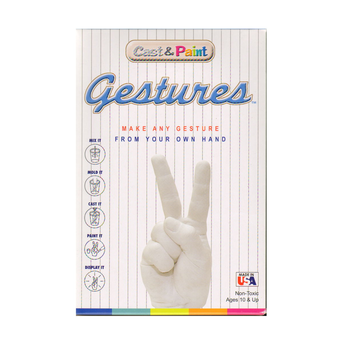 Crea un molde de tu propia mano con el gesto que prefieras. Mézclalo, moldéalo, vacíalo, píntalo y luego exhíbelo. Este kit incluye 900 g de material de moldeo PerfectCast, 450 g de alginato de alta calidad Make-a-Mold, una cubeta de moldeo de 2,5 litros, pintura y brillo, un pincel e instrucciones ilustradas.