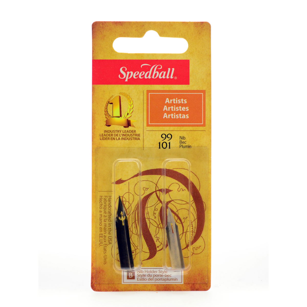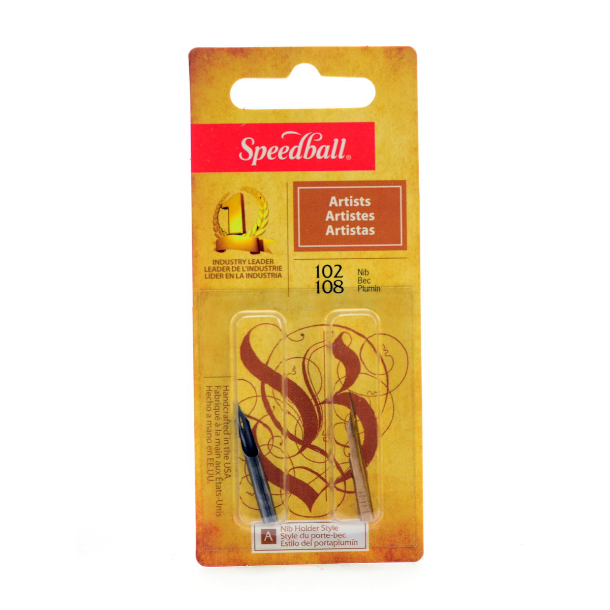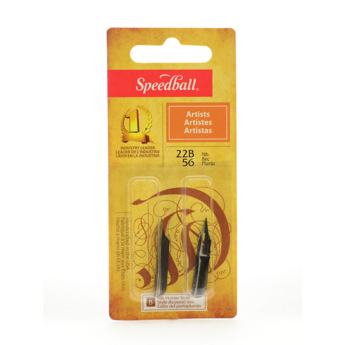Puntas Speedball Artist en paquetes surtidos para una variedad de opciones. Diseñadas con diferentes anchos de línea y grados de rigidez para un control perfecto: 22B Extrafina: para escritura ornamental y rayado fino (rigidez media); 56 Escolar: pluma de dibujo fina para escuelas de arte, acción rígida; 99 Dibujo: punta extrafina para dibujantes y litógrafos; 100 Artista: línea muy delicada para expertos; 101 Imperial: muy flexible para trabajos ornamentales; 102 Pluma Crow: la pluma artística más popular de Estados Unidos. Superfina y flexible; 103 Mapping: para mapeo y trabajos de línea fina; 104 Finest: pluma artística superfina para líneas finas y detalles minuciosos; 107 Pluma Hawk: punta superfina, más rígida que la 102, muy duradera. Para líneas largas y uniformes y detalles en cruz; 108 Pluma Flexible: para tramado, florituras y litografía; 512 Punta Bowl: pluma fina para rayado y rotulación; 513EF Globo: punta bowl extrafina para artes industriales.