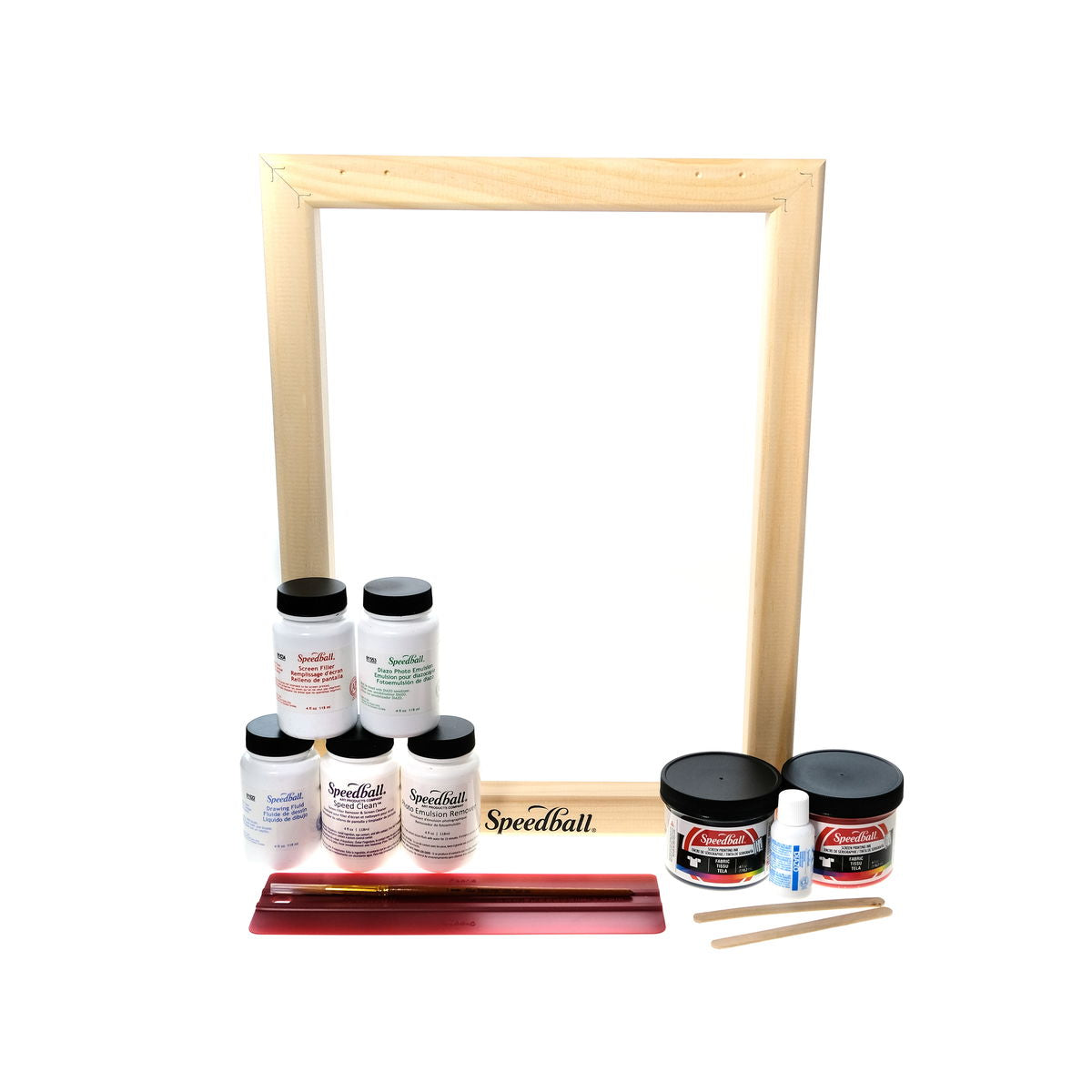 El marco de madera de 25,4 x 35,5 cm ofrece suficiente área de trabajo para impresiones de gran tamaño, a la vez que es manejable para sesiones de impresión individuales. Speedball incluye tintas para tela en negro y rojo, sus fórmulas de alta resistencia estándar, que se secan de forma fiable en algodón y mezclas sin necesidad de equipos de termofijado. La espátula Red Baron cuenta con la firme dureza necesaria para un depósito de tinta uniforme, mientras que el cepillo y los palitos de manualidades incluidos se encargan del recubrimiento con emulsión y del trabajo de detalle durante la preparación de la pantalla.