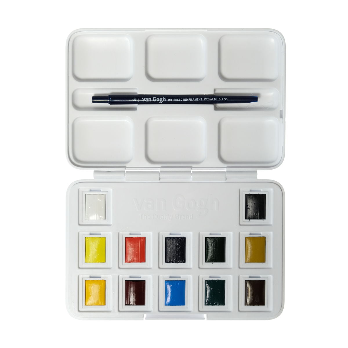 Los bocetos de campo requieren pintura que rinda a kilómetros de tu estudio. La caja de bolsillo de plástico de Van Gogh ofrece acuarelas de calidad profesional en un formato diseñado para una portabilidad auténtica, no solo para la comodidad. El estuche de plástico rígido protege las pastillas llenas durante el transporte, mientras que la paleta de mezclas integrada elimina la necesidad de equipo adicional; todo lo que necesitas cabe en el bolsillo de una chaqueta.