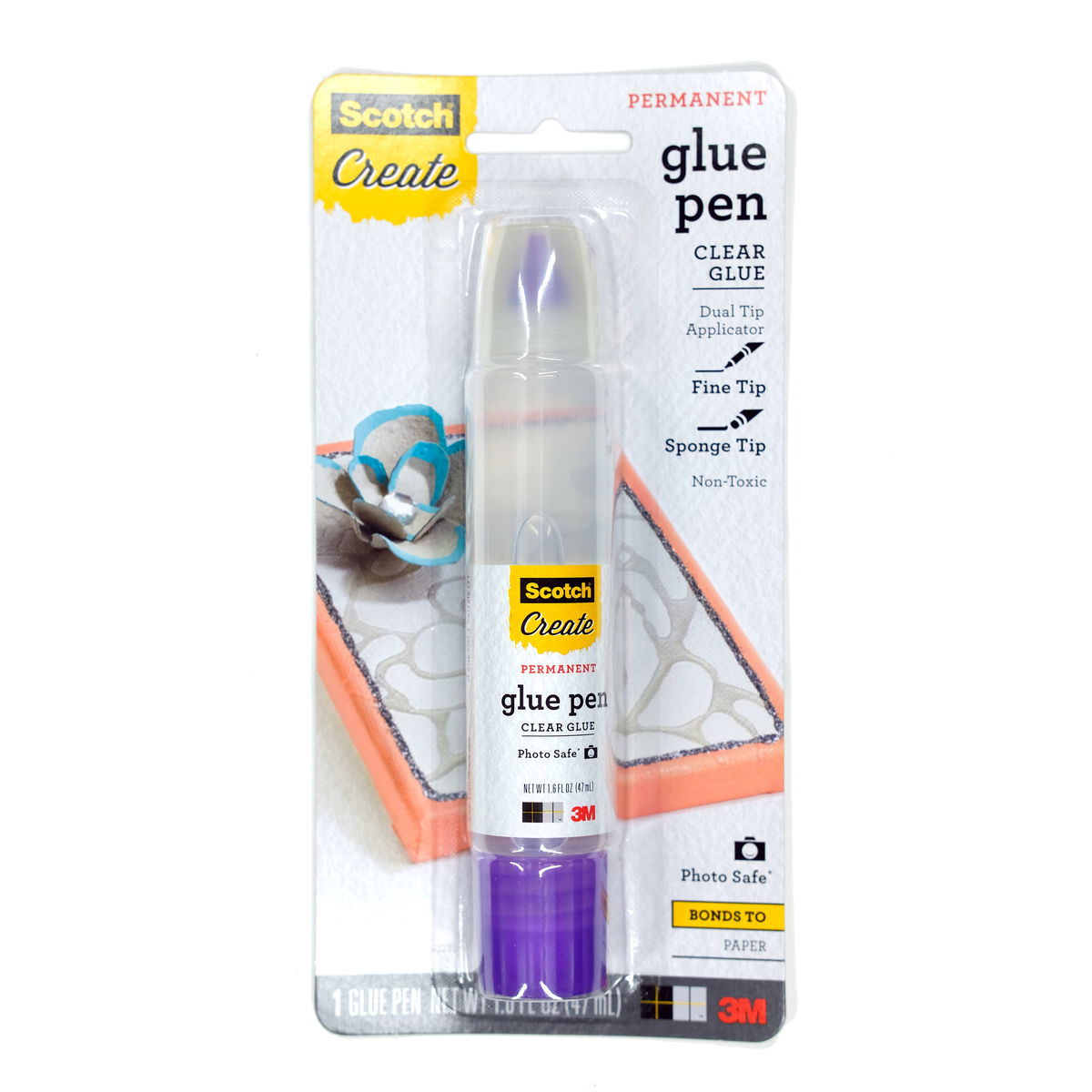 Scotch Create Glue Pen is ideal for your paper and photo attachment needs. This permanent adhesive dries clear, setting in five minutes when applied in a thin, uniform coat. It s non-toxic, photo safe, and PVC-free. With its dual tip applicator, Scotch Create Glue Pen precisely dispenses just the right amount of glue for your scrapbooking and paper craft needs. Whether you want to cover a large area with the sponge tip, or apply the slightest dab with the precision fine tip, this 1.6 fl oz. glue pen produces expert results.