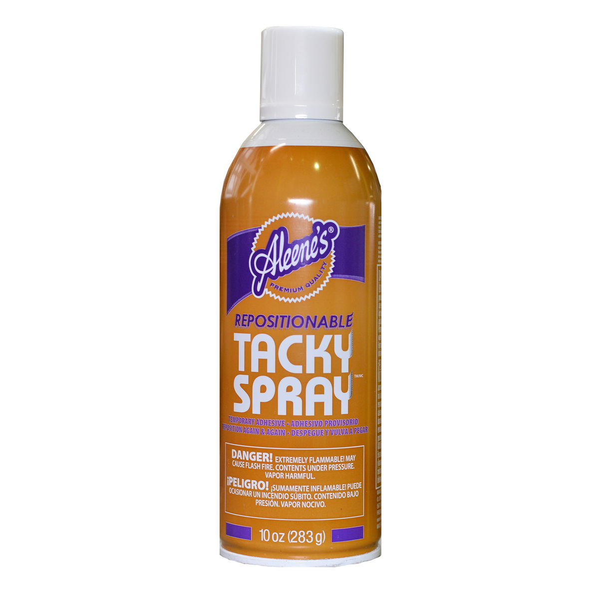 When a permanent bond isn t what you want, Aleene s Repositionable Tacky Spray is the perfect alternative. Its unique formulation dries clear, tacky and best of all repositionable so you can have a fresh start when you want it! Use it on lightweight applications like posters, wall d cor and much more. Available in an 10 oz. spray can.