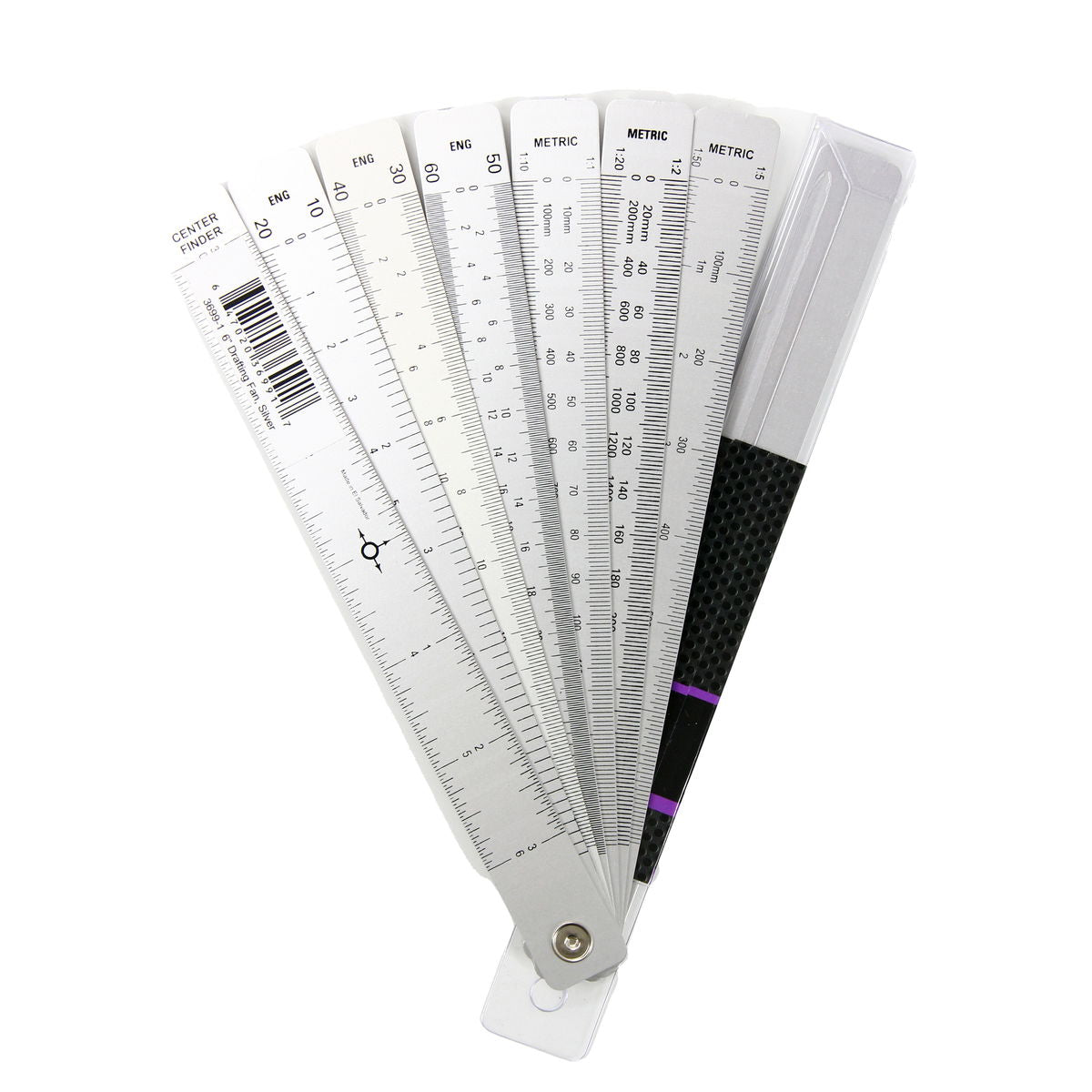 The Alumicolor Drafting Fan is a convenient all-in-one drafting tool. The fan has eight aluminum blades that hold all standard Architect, Engineer, and Metric calibrations as well as a 6 in. center finder and 6 in. Imperial ruler. Architect - 1/32, 1/16, 3/32, 1/8, 3/16, 1/4, 3/8, 1/2, 3/4, 1, 1 1/2, 3 Engineer - 10, 20, 30, 40, 50, 60 Metric - 1:20, 1:25, 1:50, 1:75, 1:100, 1:125