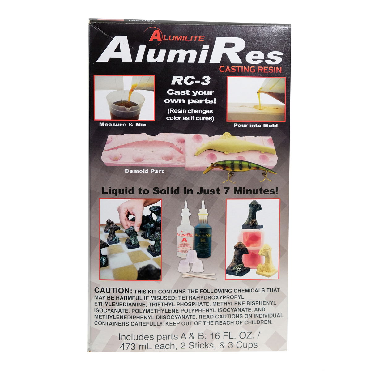RC-3 AlumiRes is extremely easy to use while keeping costs down on large projects. It has a 1:1 mix ratio by weight or volume, with a 2-minute work time. Other features include a fast 30-minute demold time (100-gram mass); virtually odorless; reproduces exact and fine details; cures to a hard durable plastic; machines beautifully; easy to tap, drill, and sand; and can be painted, sanded, and molded. Use this resin with silicone mold making rubber, Alumilite "Flex" Molds, latex, plaster, sealed wood, plastic, clay, and other non-porous materials. Kit includes parts A & B in 16 oz. bottles, 2 sticks, and 3 mixing cups.