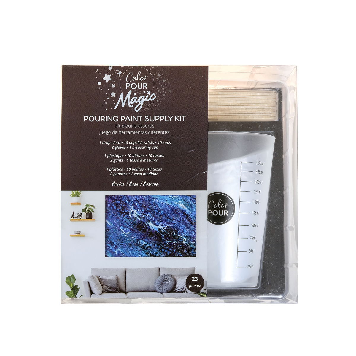 Color Pour Magic Pouring Paint Supply Kit includes all the items you'll need to replenish after each pouring session. This kit contains 10 stir sticks, 10 mixing cups, 2 gloves, 1 measuring cup and a drop cloth. All the accessory tools you'll need to pour works of art.