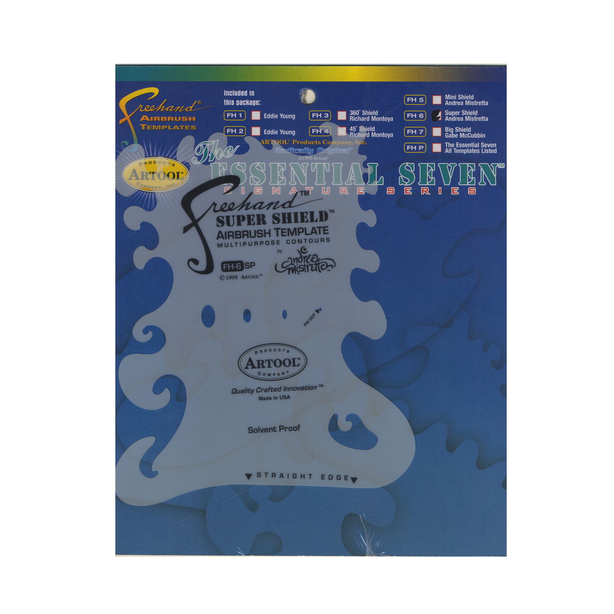 The Artool Super Shield Airbrush Template is a member of The Essential Seven airbrush template series. Designed by Richard Montoya this spectacular template is made from solvent proof Mylar, so it can be used with water-based and solvent-based painting and cleaning products. The Super Shield flexes and curves to conform to your shaped needs without fear of damaging it.