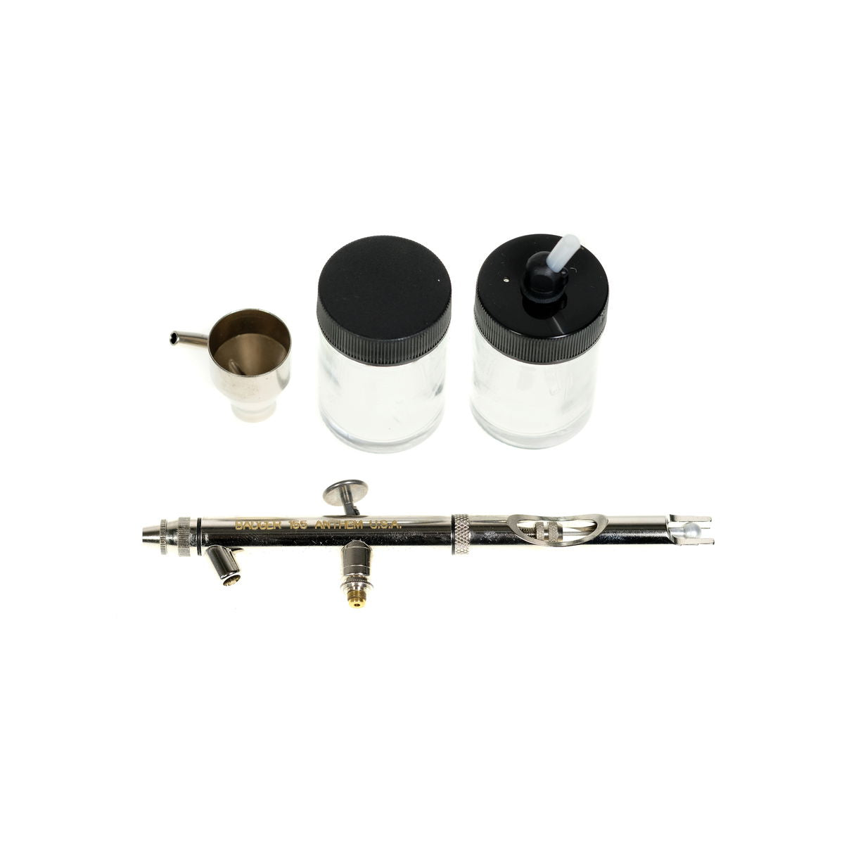 The Model 155 Anthem is a bottom-feed, double-action, internal mix airbrush. The Anthem is the most comfortable, reliable, proficient, cost effective, user-friendly airbrush ever. The two angle needle tip precisely mates with the Anthem's cone shape nozzle enabling single needle/nozzle variations. The Anthem's body design provides exacting balance and long term user comfort. For the most rigorous of production airbrushing environments.