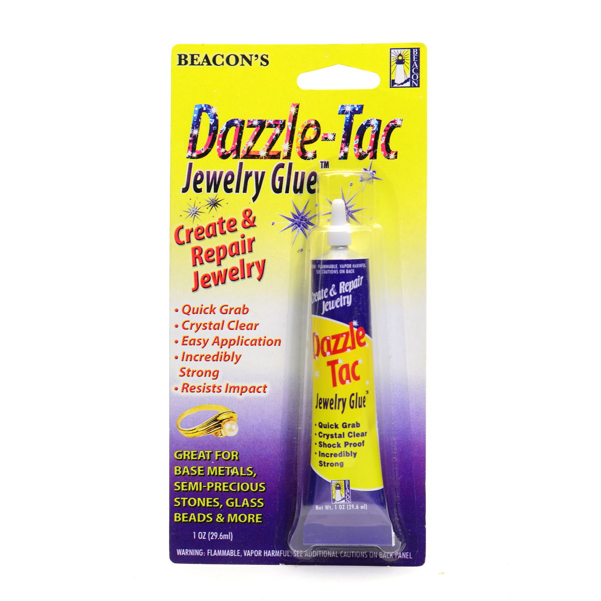 It's simple to create new jewelry or repair favorite pieces with crystal clear, super strong Dazzle-Tac. Beacon's Dazzle-Tac Jewelry Glue is the best glue for bonding base metals, semi-precious stones, glass, ceramics, plastics, beads, wire, bone, horn, mirrors, and more. Unlike "super glues," Dazzle-Tac is always flexible and never brittle when dry. With its superior impact resistant formula, you can be confident that your stones and findings will stay put.