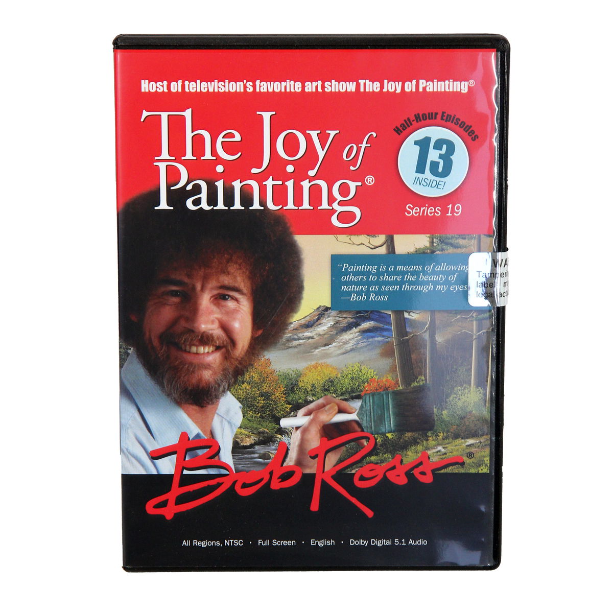 "We don't make mistakes here, we just have happy accidents. We want happy, happy paintings. If you want sad things, watch the news. Everything is possible here. This is your little universe." – Bob Ross You have seen the amazing performance of artist Bob Ross on television. Welcome now to the possibility of fulfilling your creative dreams through the Bob Ross style of Painting. Each Joy of Painting TV Series DVD contains thirteen 1/2-hr Bob Ross TV shows. With each show, Bob Ross leads you step by step through the creation of a beautiful oil painting using his famous Wet-on-Wet Technique. Simply follow along, and within minutes, you’ll have created your very own landscape, even if you have never painted before! #19 contains the following episodes: Snowfall Magic, Quiet Mountain Lake, Final Embers of Sunlight, Snowy Morn, Campers Haven, Waterfall in the Woods, Covered Bridge Oval, Scenic Seclusion, Ebb Tide, After the Rain, Winter Elegance, Evenings Peace, and Valley of Tranquility.