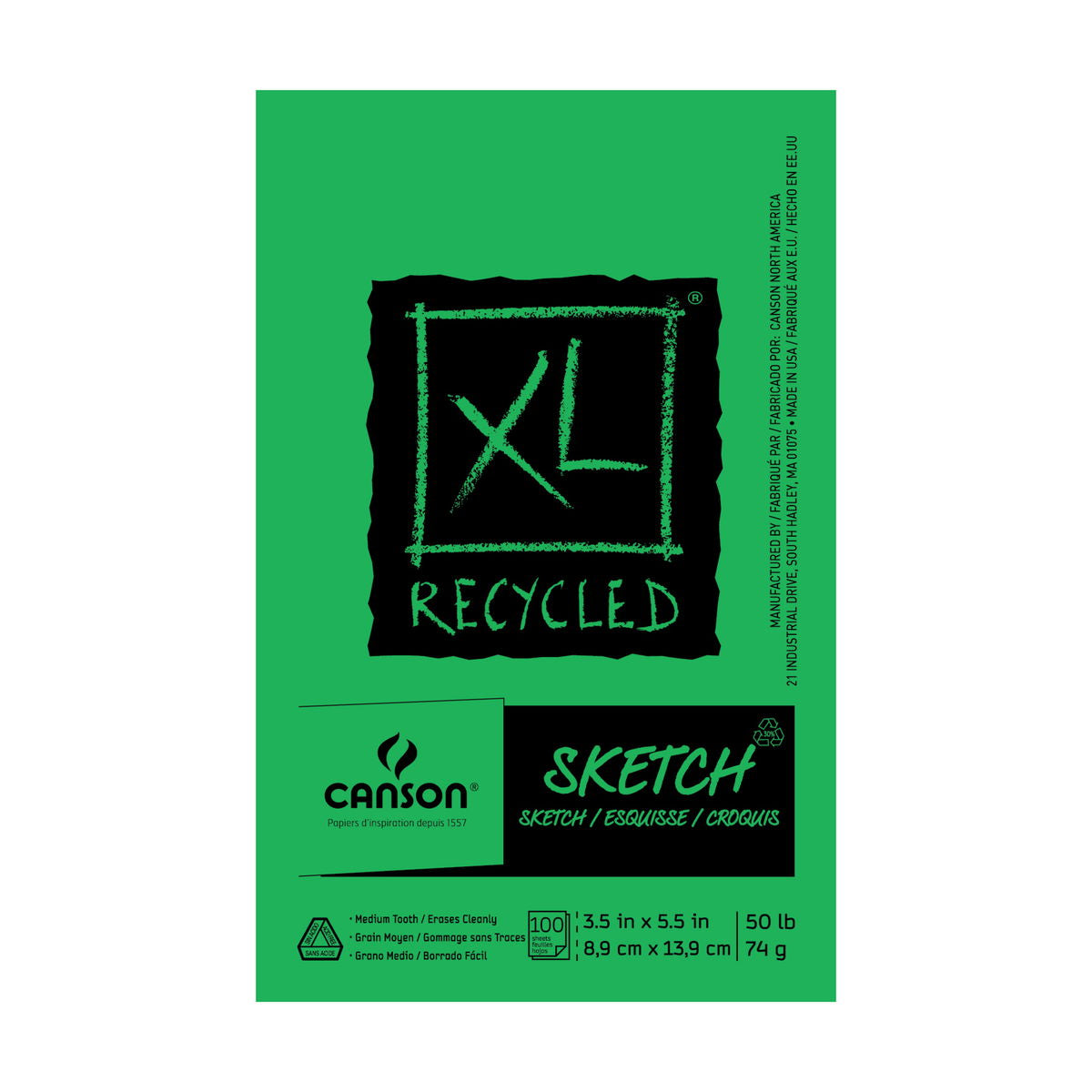 Designed to appeal to students, Canson XL recycled pads combine quality, performance, and value with a concern for the environment. Featuring superior construction and heavier-weight cover materials than other value lines, they re manufactured using environmentally friendly methods. These pads are ideal for quick sketches with pencil, charcoal, pastel, or felt-tip pen. Each pad contains multiple sheets of acid-free cold press paper made from 100% recycled cellulose that is alkaline-buffered and contains no optical brighteners. 50 lb (74 gsm) weight.
