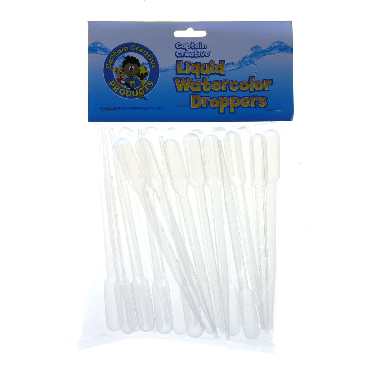 Captain Creative Liquid Watercolor Droppers are plastic eye droppers, or pipettes. Great for use with Captain Creative Liquid Watercolor Paper, but have a multitude of other craft applications. They are safe to use with children ages 3 years and up. Available in a pack of 25.