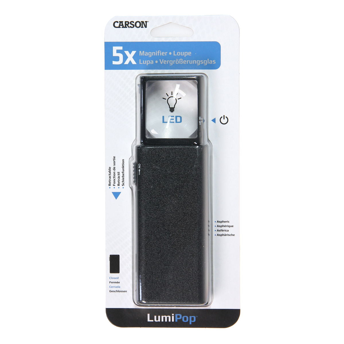 The perfect compact magnifier for reading small type in low light. Hi-power optical quality lens with bifocal insert. Sturdy and scratch resistant 2 in. x 2 in. retractable lens. Press both buttons to eject lens. Press again for illumination. For reading books, newspapers, telephone directories, small print, maps, and charts. Protective case keeps the lens safe from scratching. 2X power. Two AAA batteries included.