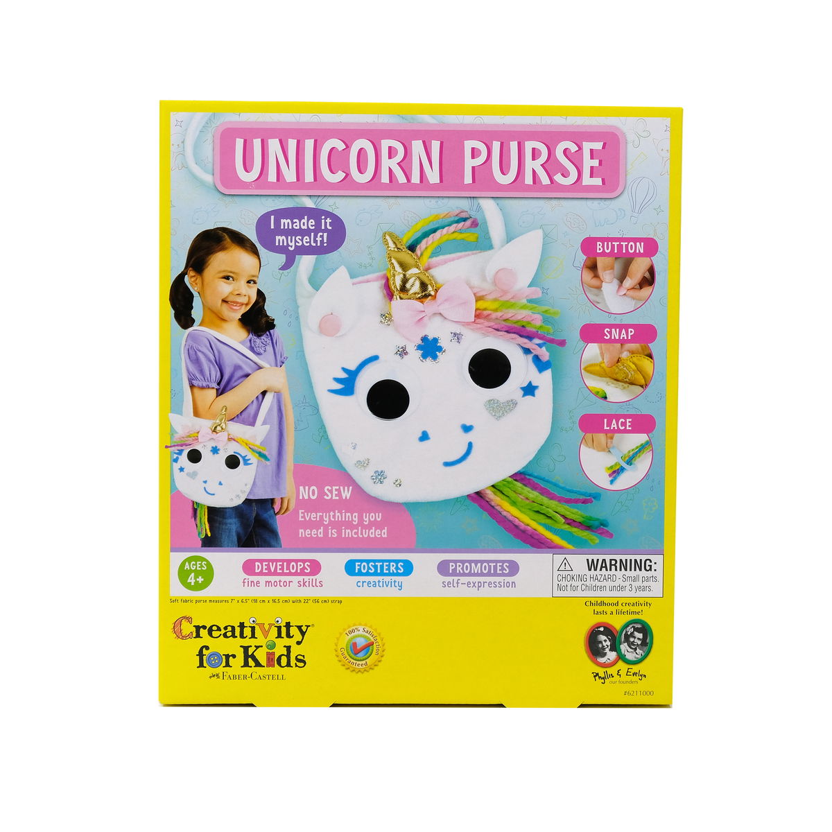 Transform this no-sew bag into a super-soft, velvety unicorn purse! Designed with little fingers in mind, this beginner craft develops fine motor skills, fosters creativity and promotes self-expression. Accessorize your purse with a golden horn, clip-on bow, rainbow yarn, velvety ears, super-sized wiggly eyes and fun fabric stickers. The completed purse measures 6 in. w x 7 in. h with a 22 in. long shoulder strap. For ages: 4+