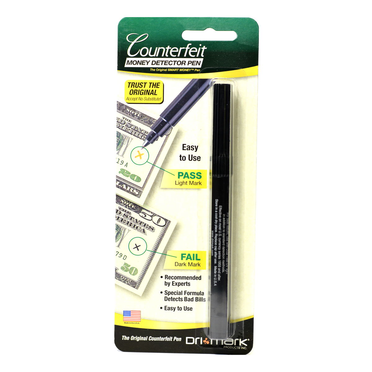 The Patented Smart Money Counterfeit Detector Pen has revolutionized counterfeit detection. Dri Mark's Counterfeit Detector pen is a highly effective and inexpensive tool for detecting bad bills and deterring counterfeiters from passing phony currency in the first place. Simply make a small mark on U.S. currency. An amber mark passes the test, a dark brown or black mark means the bill is probably counterfeit. Works on all new design U.S. currency (bills series 1959 and later). Made in the USA.