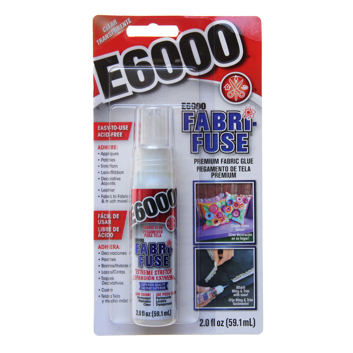 Featuring its extreme flexibility, E6000 Fabri-Fuse creates an exceptional bond without creating bumps or bulges. Your fabric remains flexible even after machine washing! Fabri-Fuse permanent bond dries clear and is acid-free with almost no odor. The fabric can even be sewn through once dry. Use on all your fabric craft and hobby projects. Available in 0.2 fl. oz. bottle with an applicator tip.