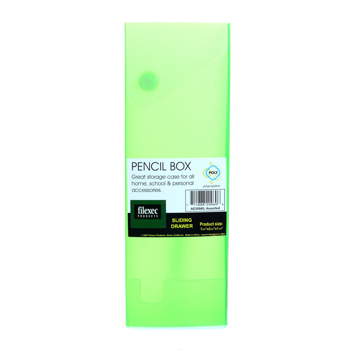 Filexec Pencil Boxes are functional and well made, great for a variety of uses. These cases feature a snap button closure and a convenient sliding drawer to secure whatever you put inside. Available in four colors; color chosen at random from available stock.