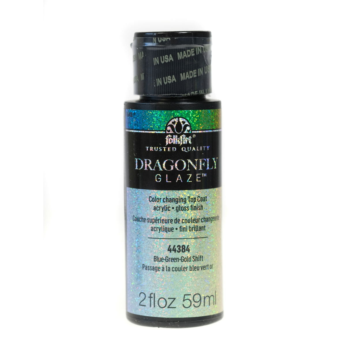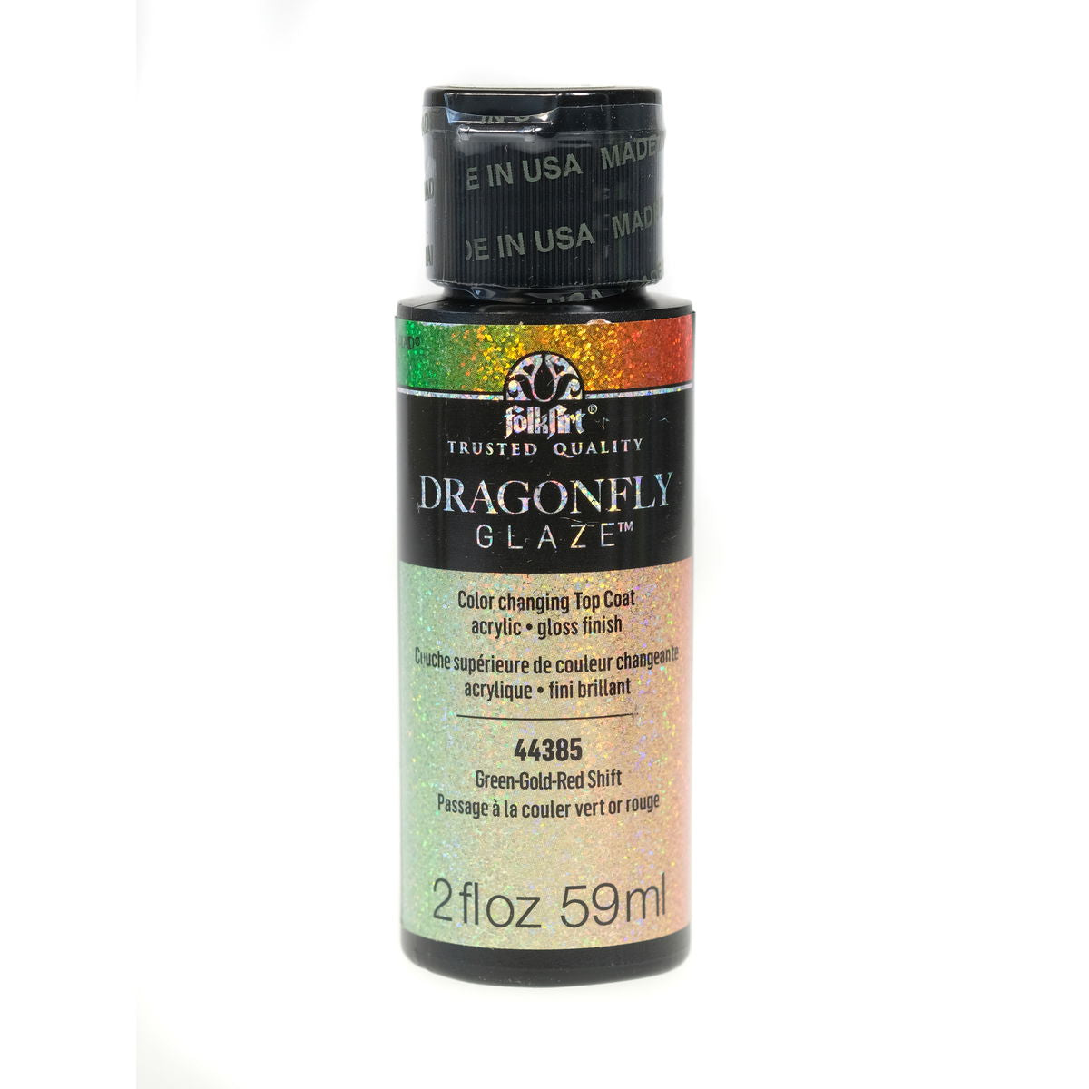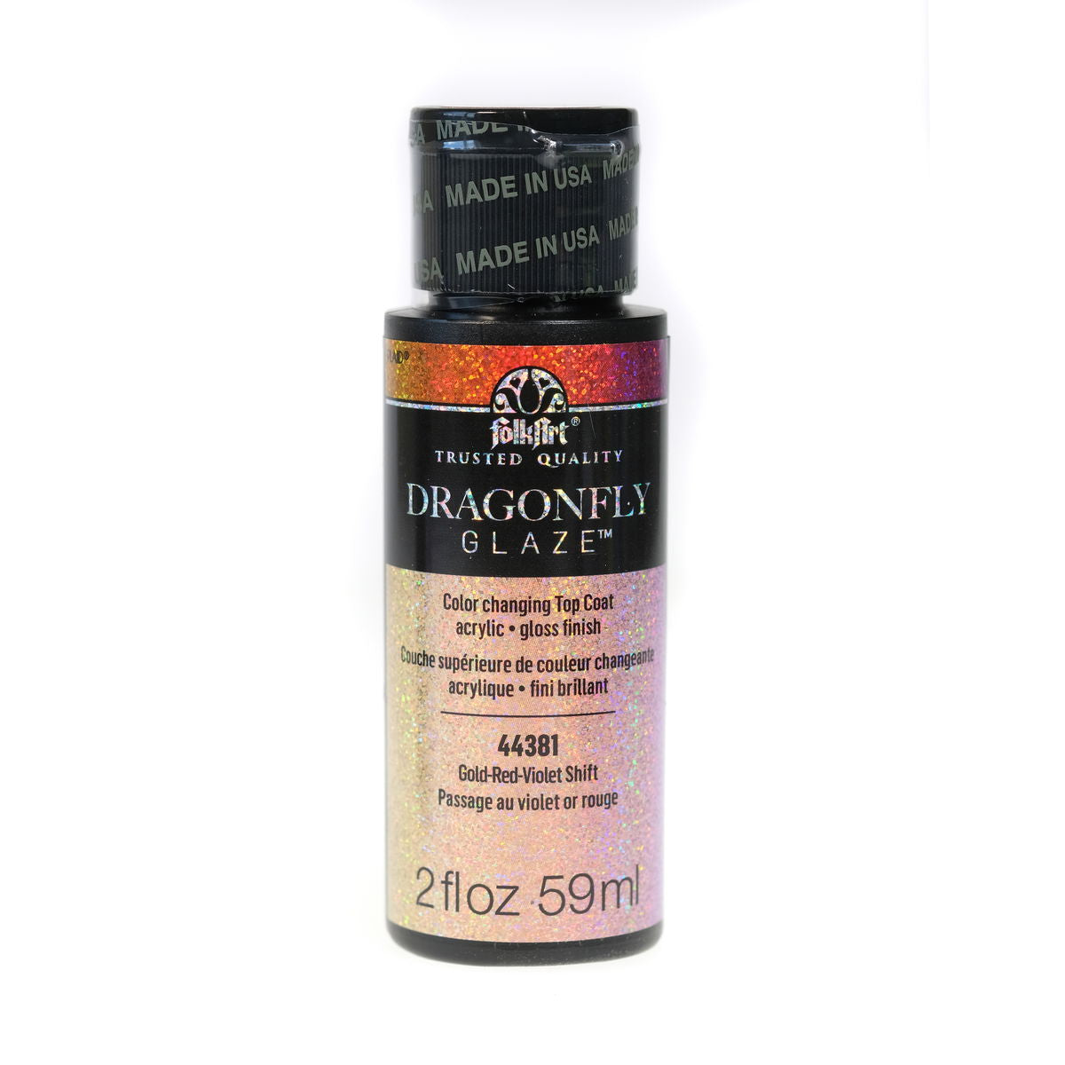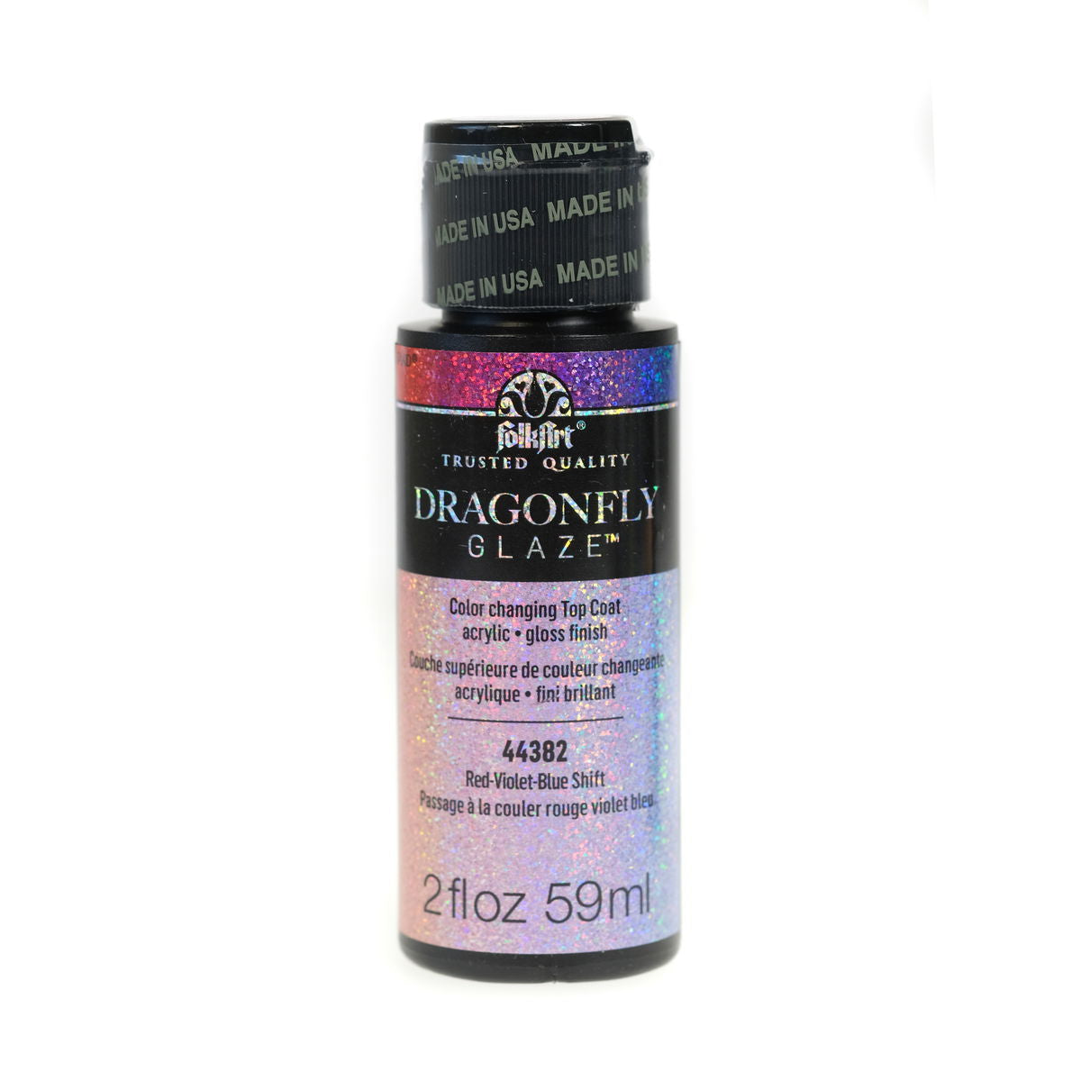 Dragonfly Glaze is a color changing top coat acrylic with a gloss finish. The Indoor/Outdoor Multi-Surface formula uses special optical variable pigments to create unique optical illusions. Multiple colors are visible at different viewing angles. Dark Base colors create the most vivid effects.