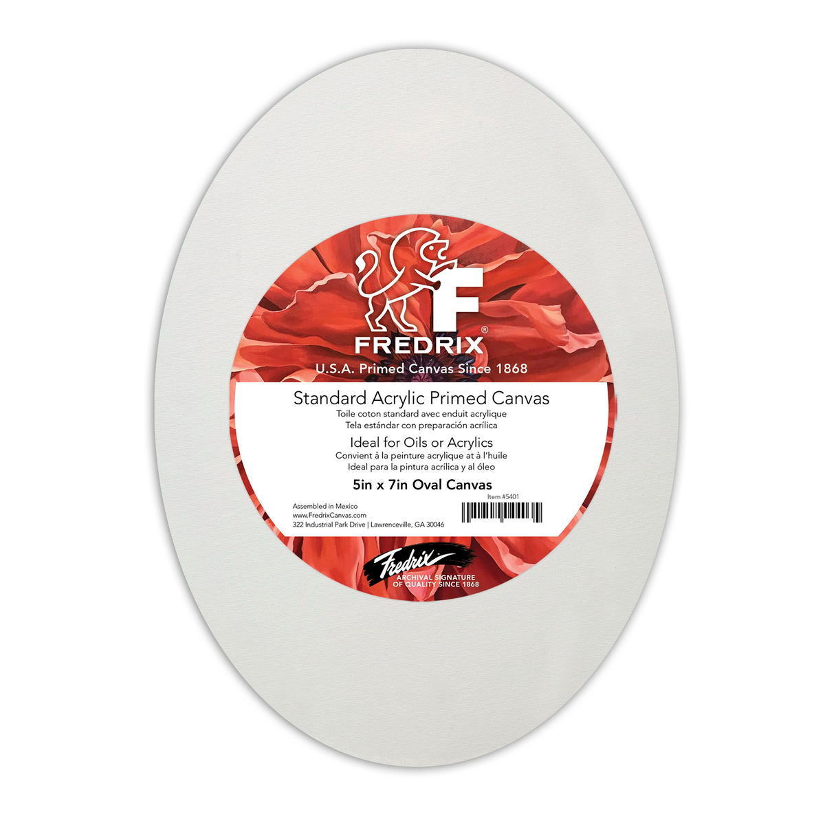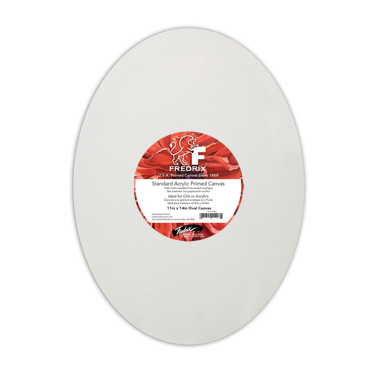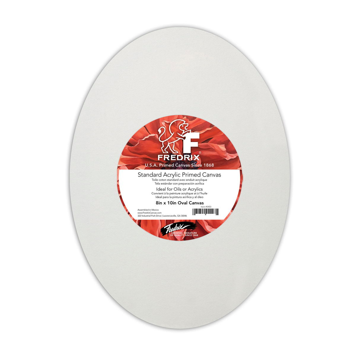 Pre-stretched oval canvas. 100 percent medium texture, acrylic titanium double primed cotton duck. Ready to paint for use with oil or acrylic paints. Popular for fine arts paintings or crafts. 1/2 in. deep. Canvas edges are glued (not stapled) around the edges of the particle board wood frame. Acid free.