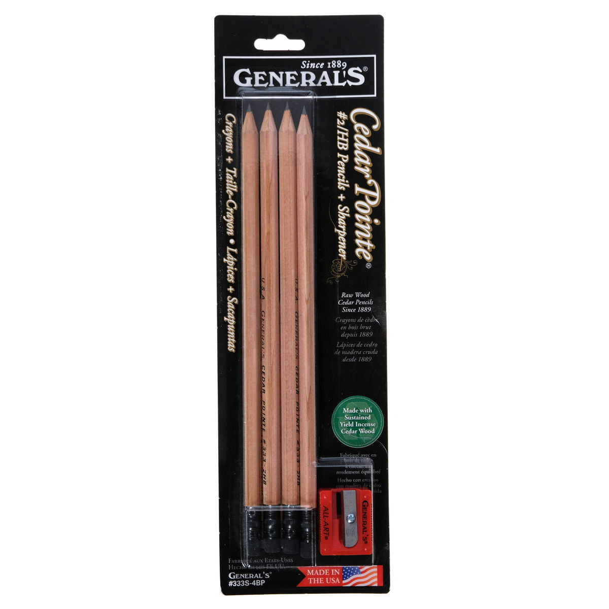 Cedar Pointe Pencils are School and Writing Graphite Pencils made with sustained yield incense Cedar Wood. They are hex shaped and black eraser tipped. The pack includes 4 each 333-2HB Cedar Pointe Pencils and a S-650 All-Art Sharpener.
